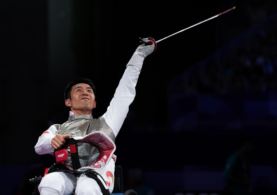 Sun Gang of China celebrates after the men's foil category A gold medal bout at the Paris 2024 Paralympic Games in Paris, France, Sept. 4, 2024. (Xinhua/Xing Guangli)