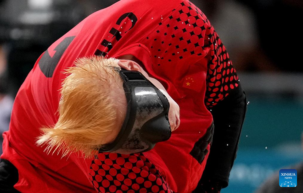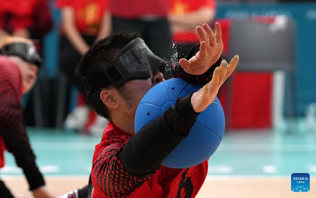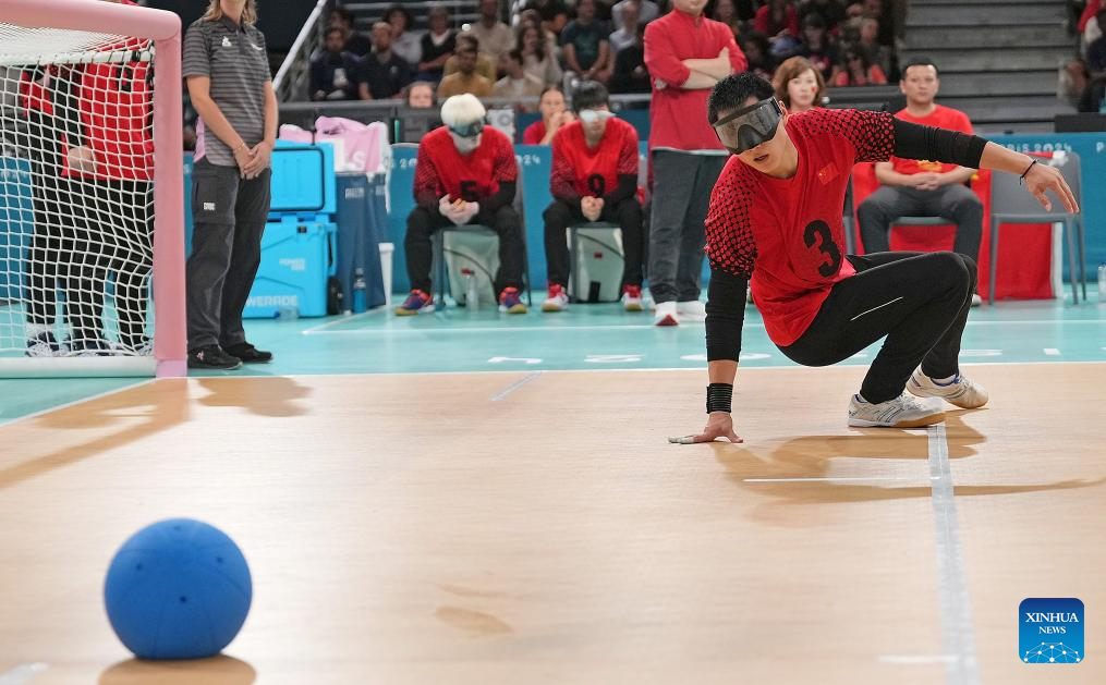 Yu Deyi of China competes during the Goalball men's semifinal match between China and Japan at the Paris 2024 Paralympic Games in Paris, France, Sept. 4, 2024. (Xinhua/Hou Zhaokang)