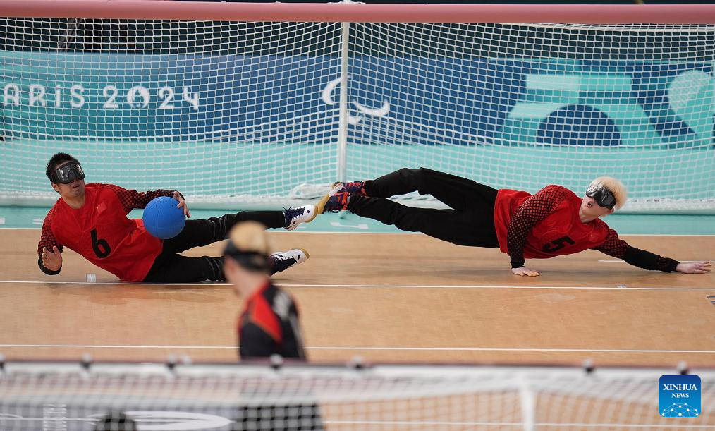 China's Yu Qinquan (L) and Hu Mingyao compete during the Goalball men's semifinal match between China and Japan at the Paris 2024 Paralympic Games in Paris, France, Sept. 4, 2024. (Xinhua/Hou Zhaokang)