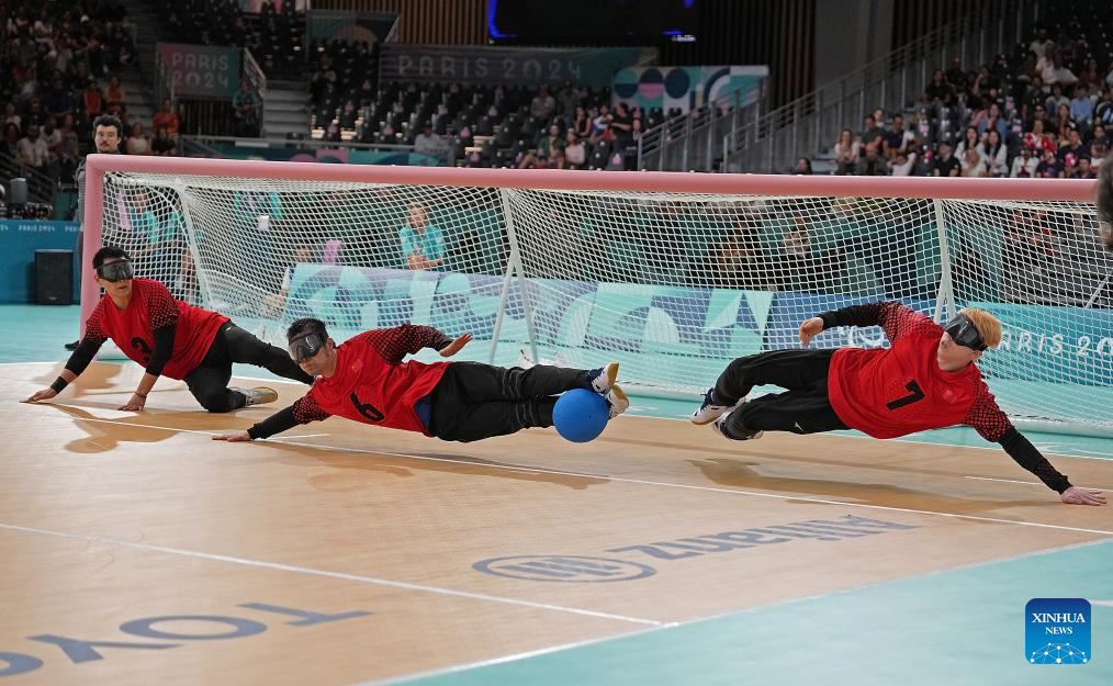 China's Yang Mingyuan, Yu Qinquan, and Yu Deyi (from L to R) compete during the Goalball men's semifinal match between China and Japan at the Paris 2024 Paralympic Games in Paris, France, Sept. 4, 2024. (Xinhua/Hou Zhaokang)