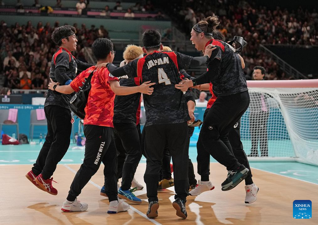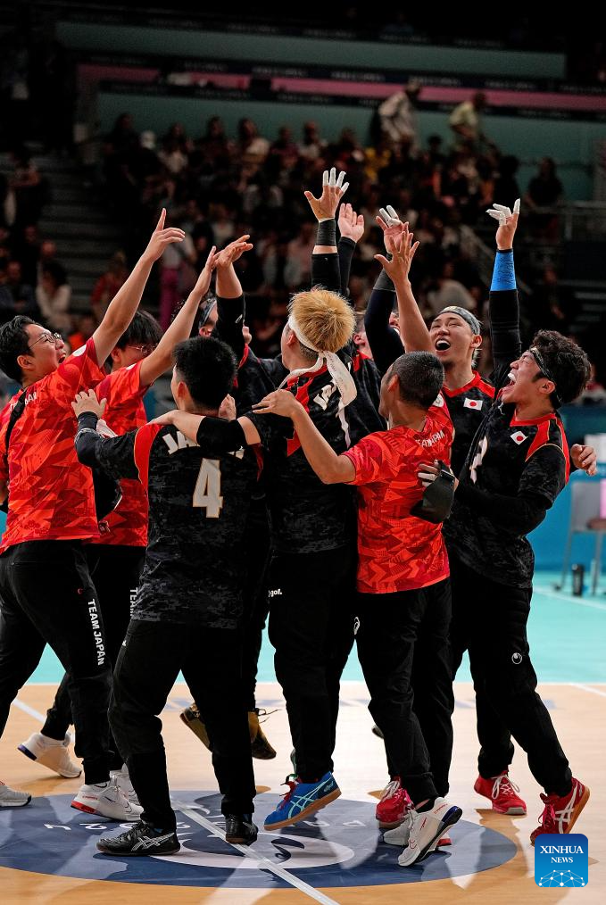 Players of Japan celebrate after the Goalball men's semifinal match between China and Japan at the Paris 2024 Paralympic Games in Paris, France, Sept. 4, 2024. (Xinhua/Hou Zhaokang)