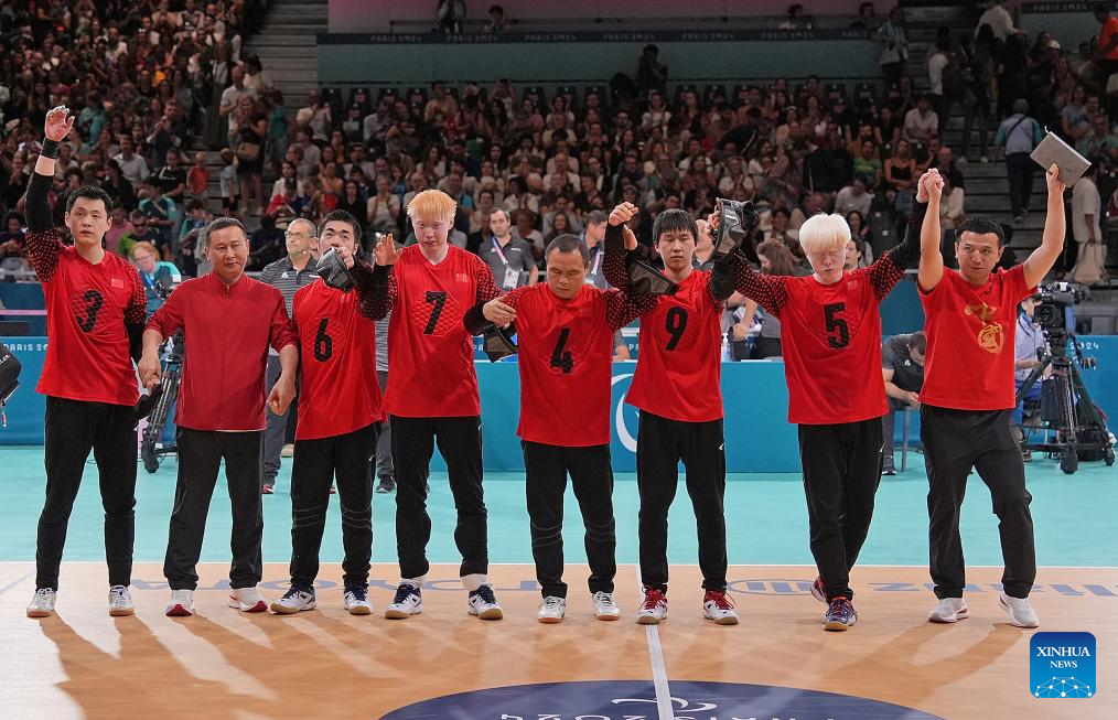 Players of China greet the audience after the Goalball men's semifinal match between China and Japan at the Paris 2024 Paralympic Games in Paris, France, Sept. 4, 2024. (Xinhua/Hou Zhaokang)