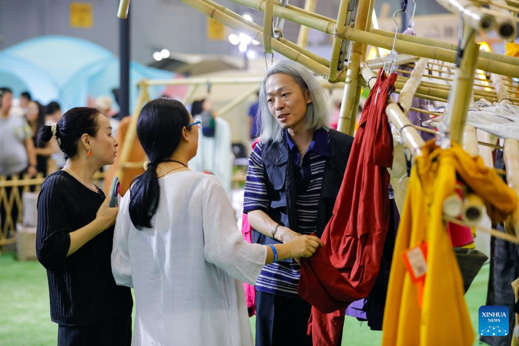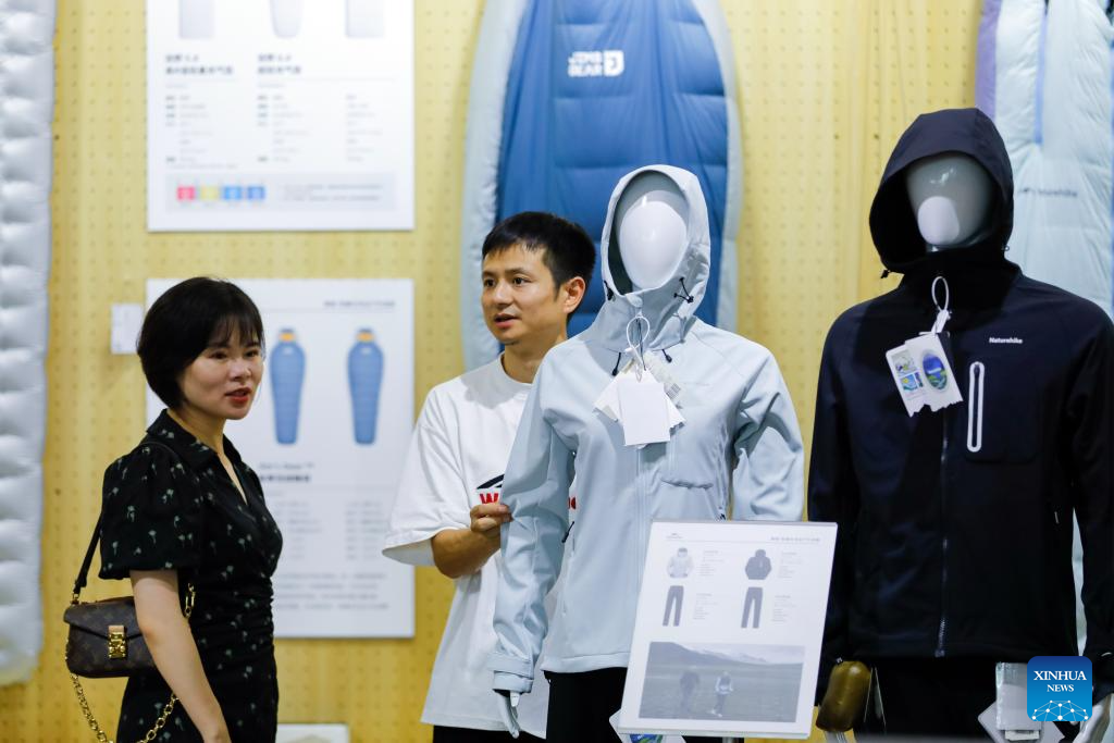 Visitors pick outdoor outfits at China Camping Life Expo in Chengdu, southwest China's Sichuan Province, Sept. 6, 2024. The three-day expo kicked off on Friday, showcasing outdoor products from nearly a hundred outdoor brands. (Xinhua/Shen Bohan)