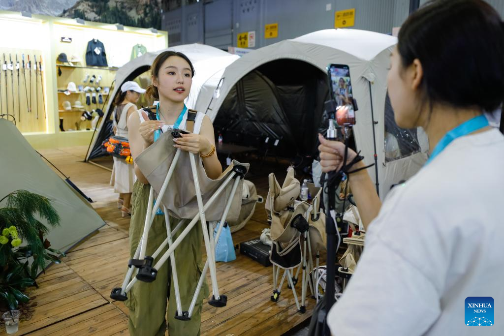 Exhibitors introduce outdoor products via livestreaming at China Camping Life Expo in Chengdu, southwest China's Sichuan Province, Sept. 6, 2024. The three-day expo kicked off on Friday, showcasing outdoor products from nearly a hundred outdoor brands. (Xinhua/Shen Bohan)