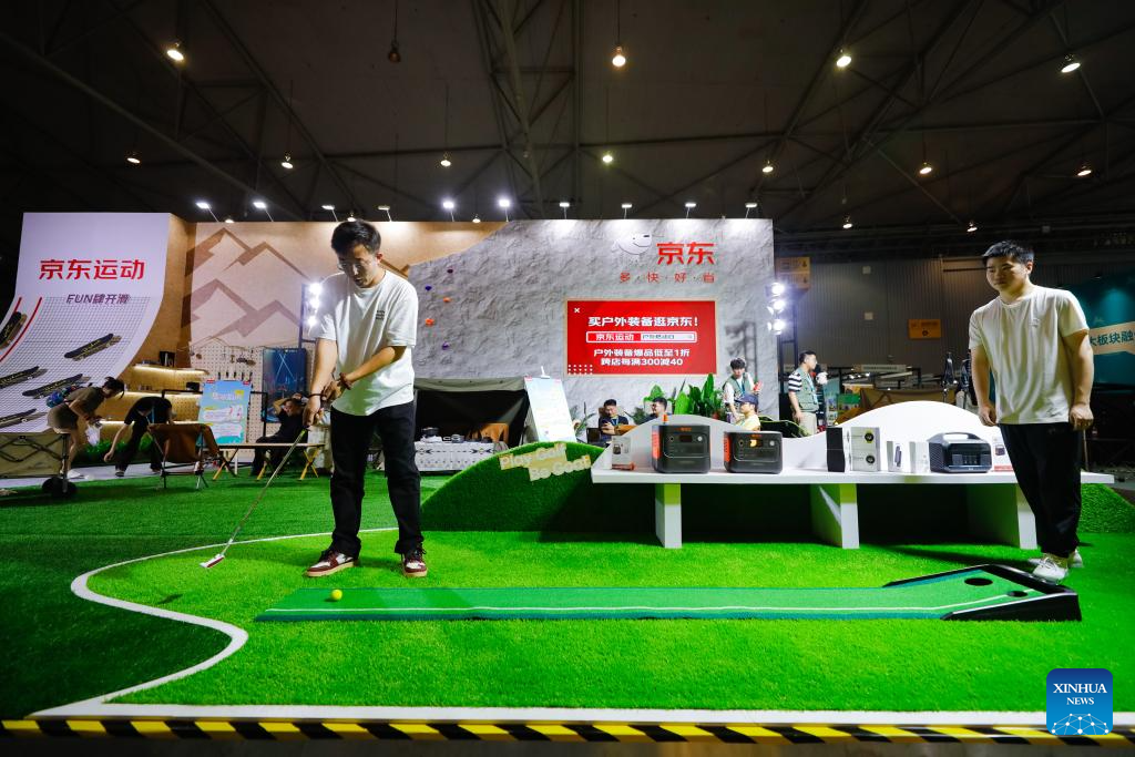 A visitor plays mini-golf at China Camping Life Expo in Chengdu, southwest China's Sichuan Province, Sept. 6, 2024. The three-day expo kicked off on Friday, showcasing outdoor products from nearly a hundred outdoor brands. (Xinhua/Shen Bohan)