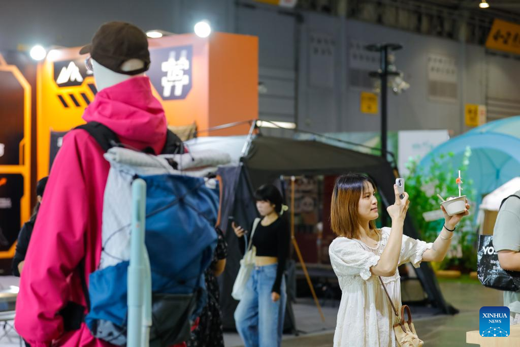 A visitor takes a picture at China Camping Life Expo in Chengdu, southwest China's Sichuan Province, Sept. 6, 2024. The three-day expo kicked off on Friday, showcasing outdoor products from nearly a hundred outdoor brands. (Xinhua/Shen Bohan)