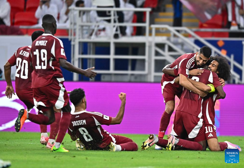Players of Qatar celebrate scoring during the Group A match of 2026 FIFA World Cup Asian qualifiers between Qatar and the United Arab Emirates in Al Rayyan, Qatar, Sept. 5, 2024. (Photo by Nikku/Xinhua)