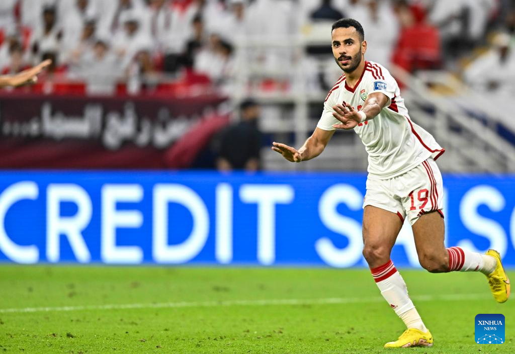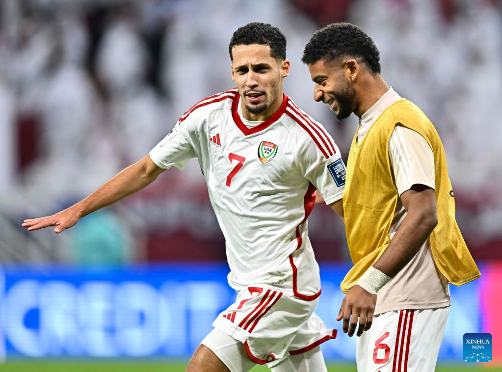 Ali Saleh Amro (L) of the United Arab Emirates celebrates after scoring during the Group A match of 2026 FIFA World Cup Asian qualifiers between Qatar and the United Arab Emirates in Al Rayyan, Qatar, Sept. 5, 2024. (Photo by Nikku/Xinhua)