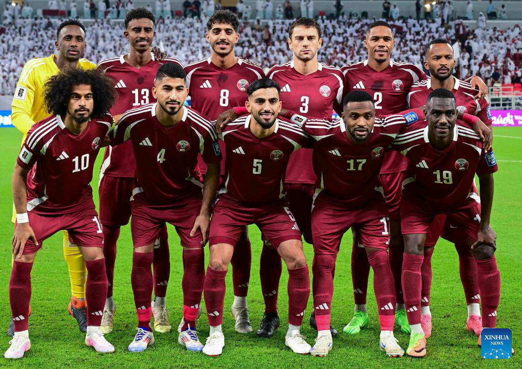 Players of Qatar pose for photos before the Group A match of 2026 FIFA World Cup Asian qualifiers between Qatar and the United Arab Emirates in Al Rayyan, Qatar, Sept. 5, 2024. (Photo by Nikku/Xinhua)