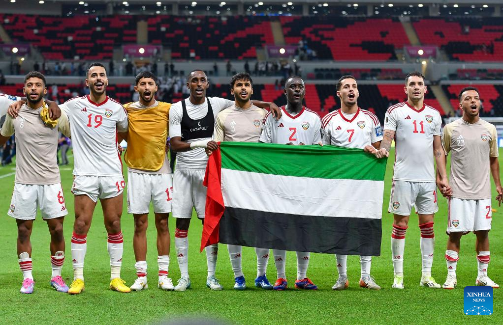 Members of the United Arab Emirates celebrate after the Group A match of 2026 FIFA World Cup Asian qualifiers between Qatar and the United Arab Emirates in Al Rayyan, Qatar, Sept. 5, 2024. (Photo by Nikku/Xinhua)