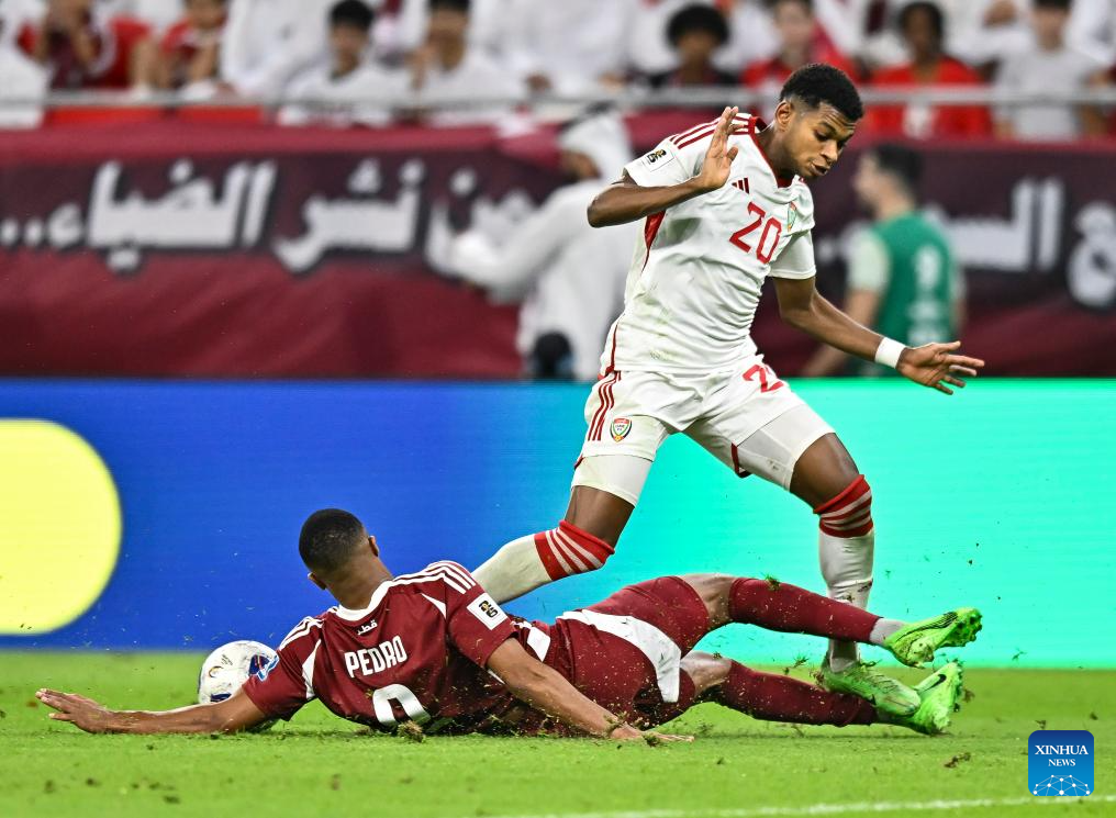 Jassem Gaber Abdulsallam (1st R) of Qatar vies with Tahnoon Hamdan (2nd R) of the United Arab Emirates during the Group A match of 2026 FIFA World Cup Asian qualifiers between Qatar and the United Arab Emirates in Al Rayyan, Qatar, Sept. 5, 2024. (Photo by Nikku/Xinhua)