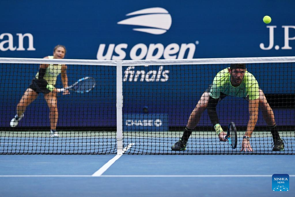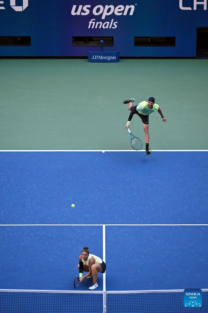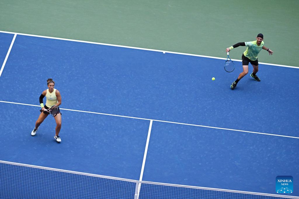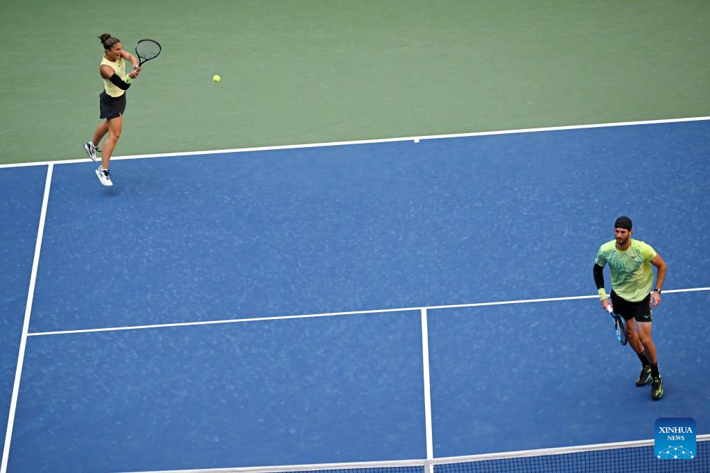 Sara Errani and Andrea Vavassori (R) compete during the mixed final match between Sara Errani/Andrea Vavassori of Italy and Donald Young/Taylor Townsend of the United States at the 2024 US Open tennis championships in New York, the United States, Sept. 5, 2024. (Xinhua/Li Rui)