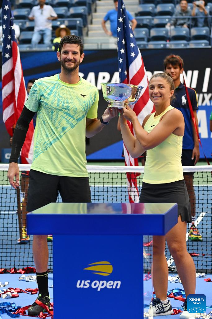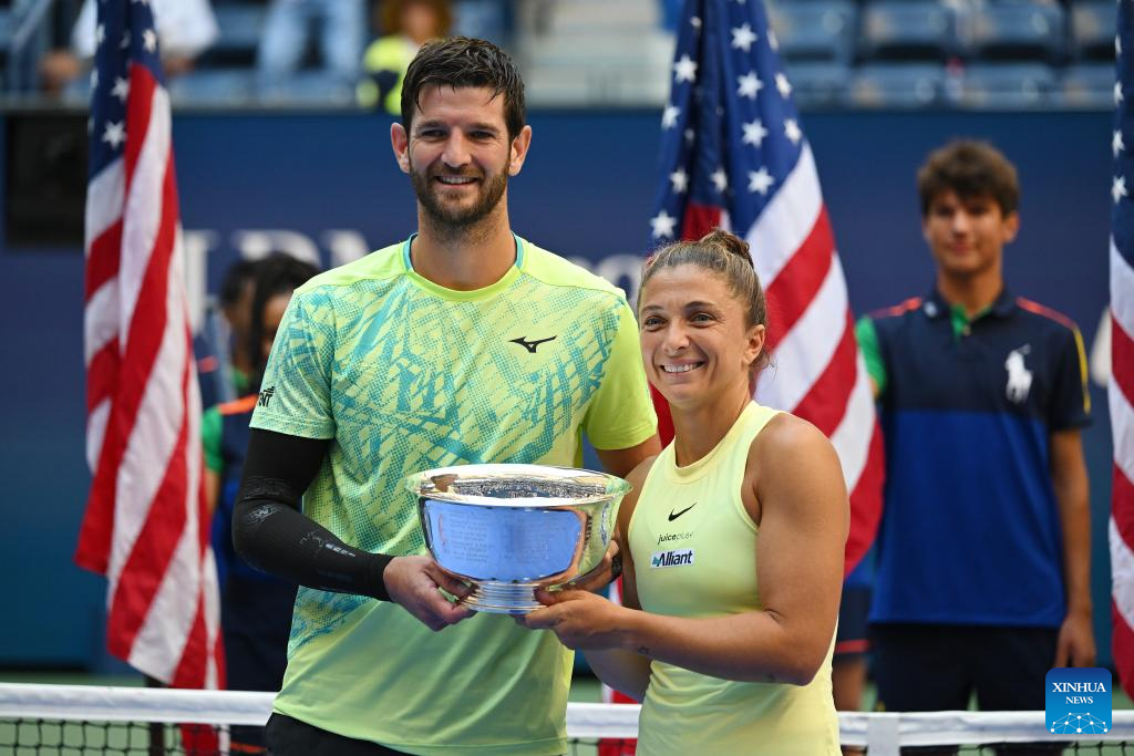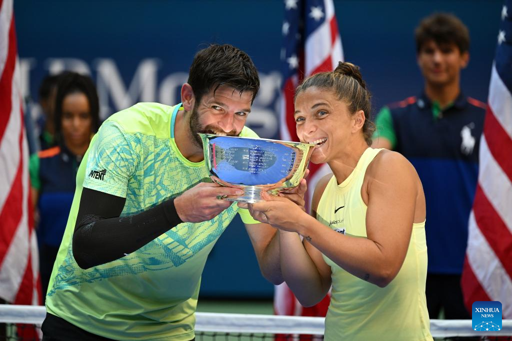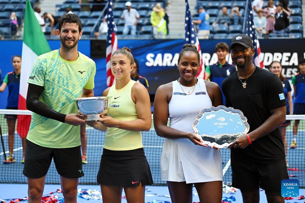 Sara Errani and Andrea Vavassori (L) celebrate with the trophy during the victory ceremony for the mixed final match between Sara Errani/Andrea Vavassori of Italy and Donald Young/Taylor Townsend of the United States at the 2024 US Open tennis championships in New York, the United States, Sept. 5, 2024. (Xinhua/Li Rui)