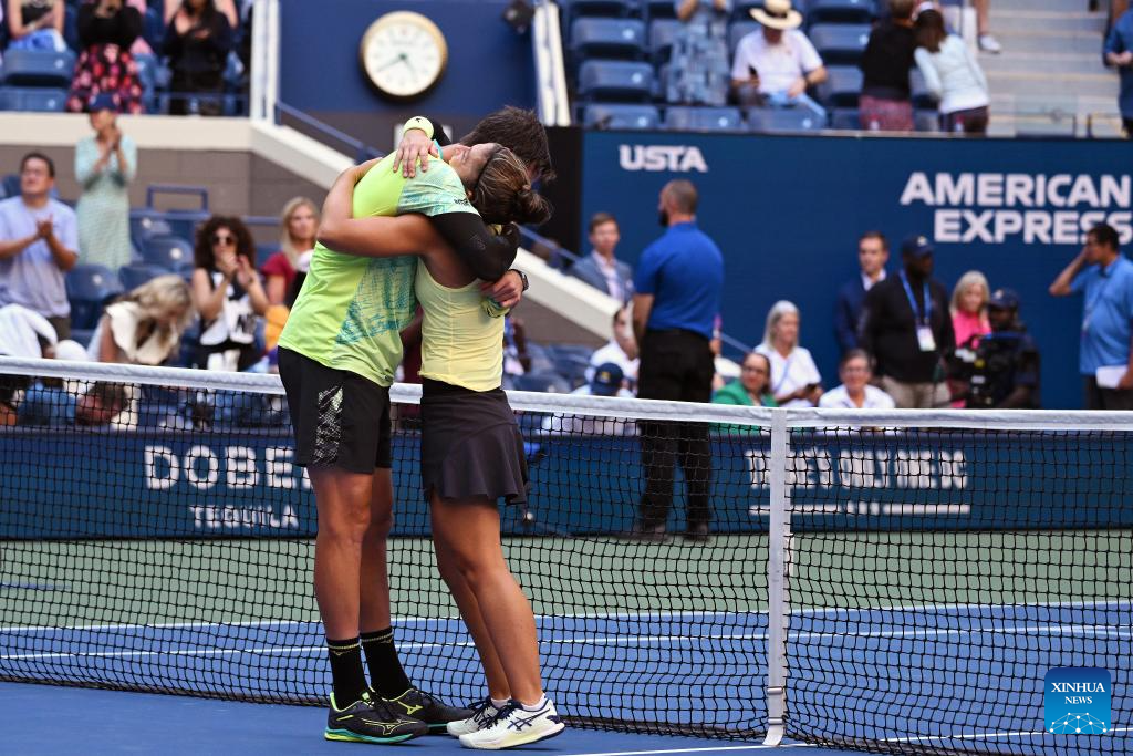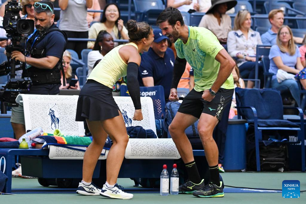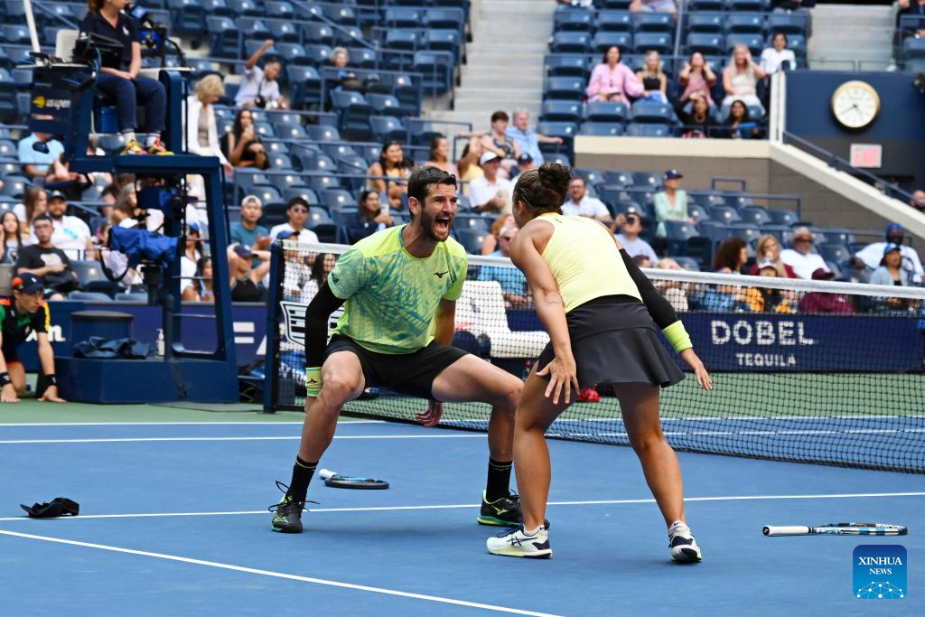 Sara Errani and Andrea Vavassori (L) celebrate after the mixed final match between Sara Errani/Andrea Vavassori of Italy and Donald Young/Taylor Townsend of the United States at the 2024 US Open tennis championships in New York, the United States, Sept. 5, 2024. (Xinhua/Li Rui)