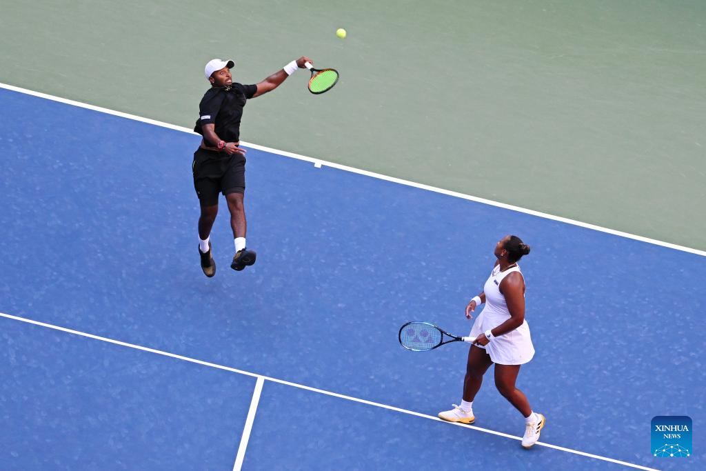 Donald Young and Taylor Townsend (R) compete during the mixed final match between Sara Errani/Andrea Vavassori of Italy and Donald Young/Taylor Townsend of the United States at the 2024 US Open tennis championships in New York, the United States, Sept. 5, 2024. (Xinhua/Li Rui)