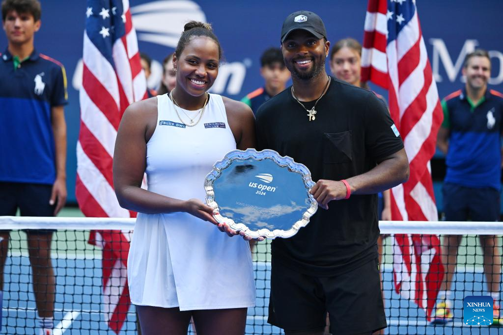 Donald Young(R) and Taylor Townsend celebrate during the victory ceremony for the mixed final match between Sara Errani/Andrea Vavassori of Italy and Donald Young/Taylor Townsend of the United States at the 2024 US Open tennis championships in New York, the United States, Sept. 5, 2024. (Xinhua/Li Rui)