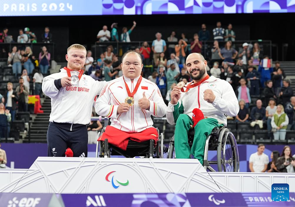 Gold medalist Zou Yi (C) of China, silver medalist Mark Swan (L) of Britain and bronze medalist Hocine Bettir of Algeria pose during the awarding ceremony for the para powerlifting men's up to 65kg event at the Paris 2024 Paralympic Games in Paris, France, Sept. 5, 2024. (Xinhua/Lian Yi)