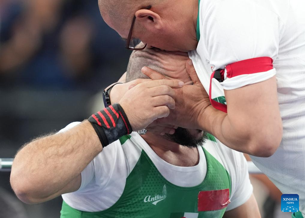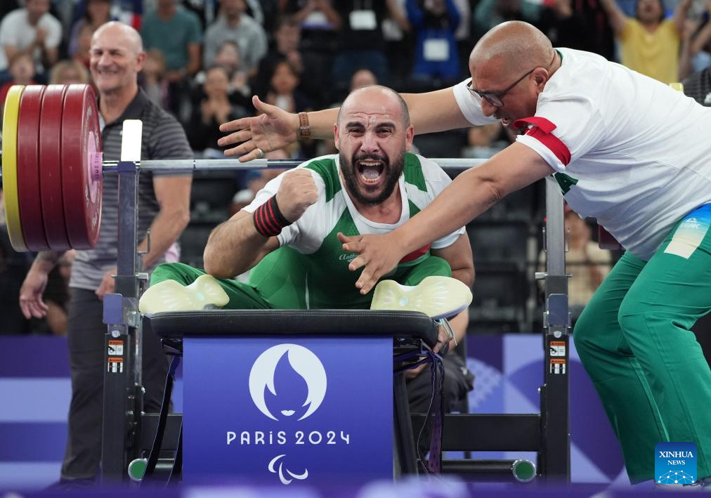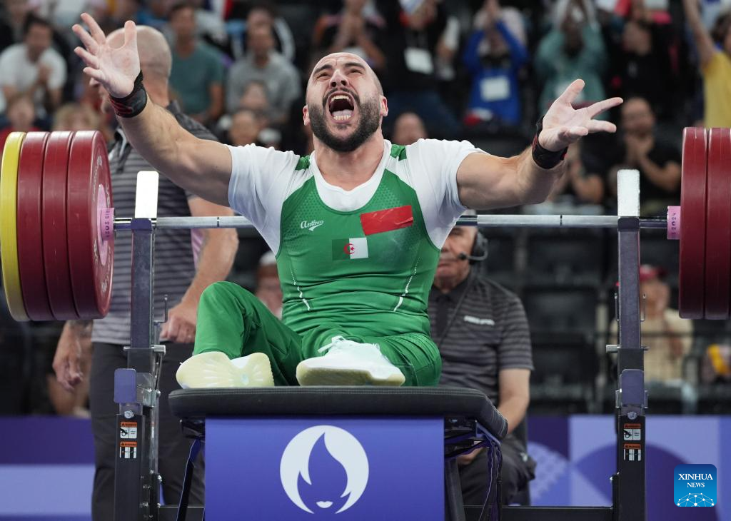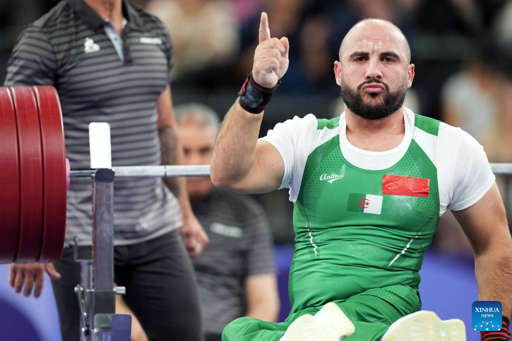Hocine Bettir of Algeria reacts during the para powerlifting men's up to 65kg final at the Paris 2024 Paralympic Games in Paris, France, Sept. 5, 2024. (Xinhua/Lian Yi)