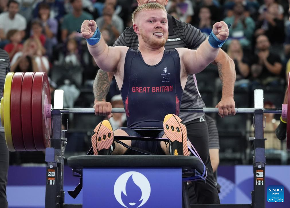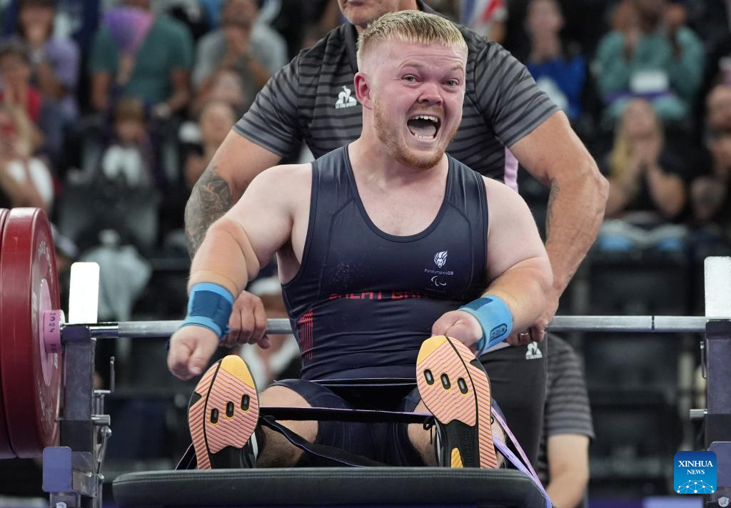 Mark Swan of Britain reacts during the para powerlifting men's up to 65kg final at the Paris 2024 Paralympic Games in Paris, France, Sept. 5, 2024. (Xinhua/Lian Yi)