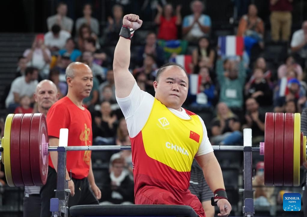 Zou Yi of China celebrates during the para powerlifting men's up to 65kg final at the Paris 2024 Paralympic Games in Paris, France, Sept. 5, 2024. (Xinhua/Lian Yi)