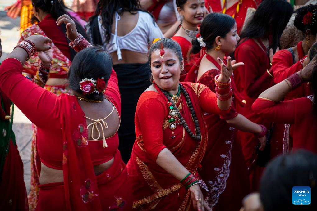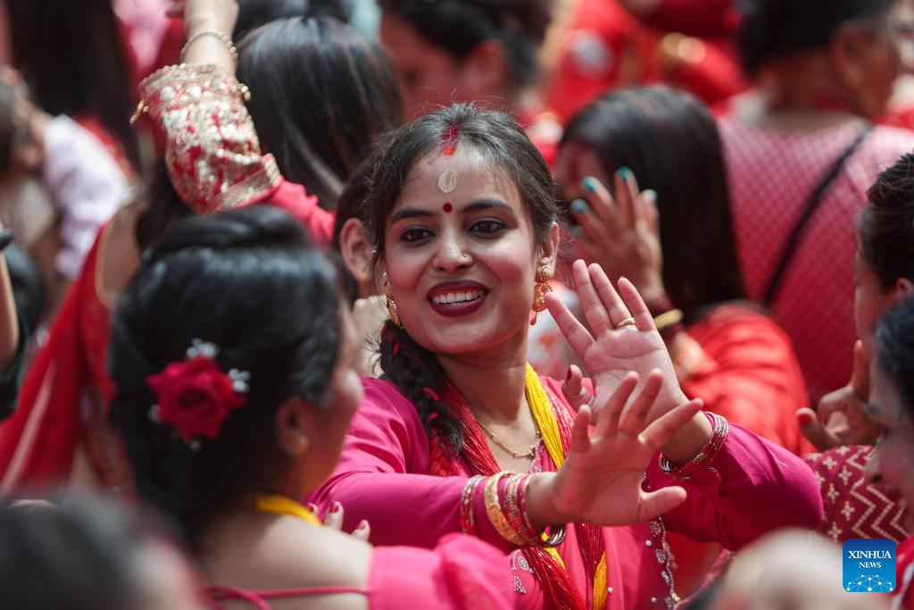 Women celebrate the Teej Festival at the Pashupatinath Temple in Kathmandu, Nepal, Sept. 6, 2024. During the festival, married women fast and pray for good health and longevity of their husbands and unmarried women pray for marrying ideal husbands. (Photo by Sulav Shrestha/Xinhua)