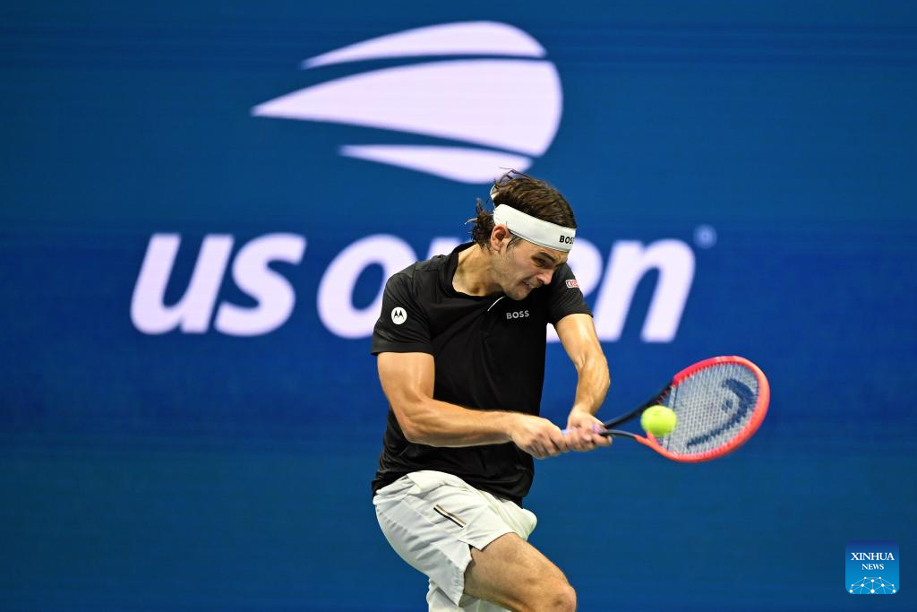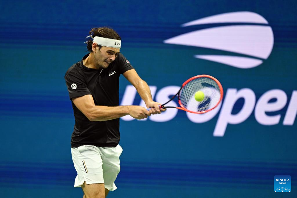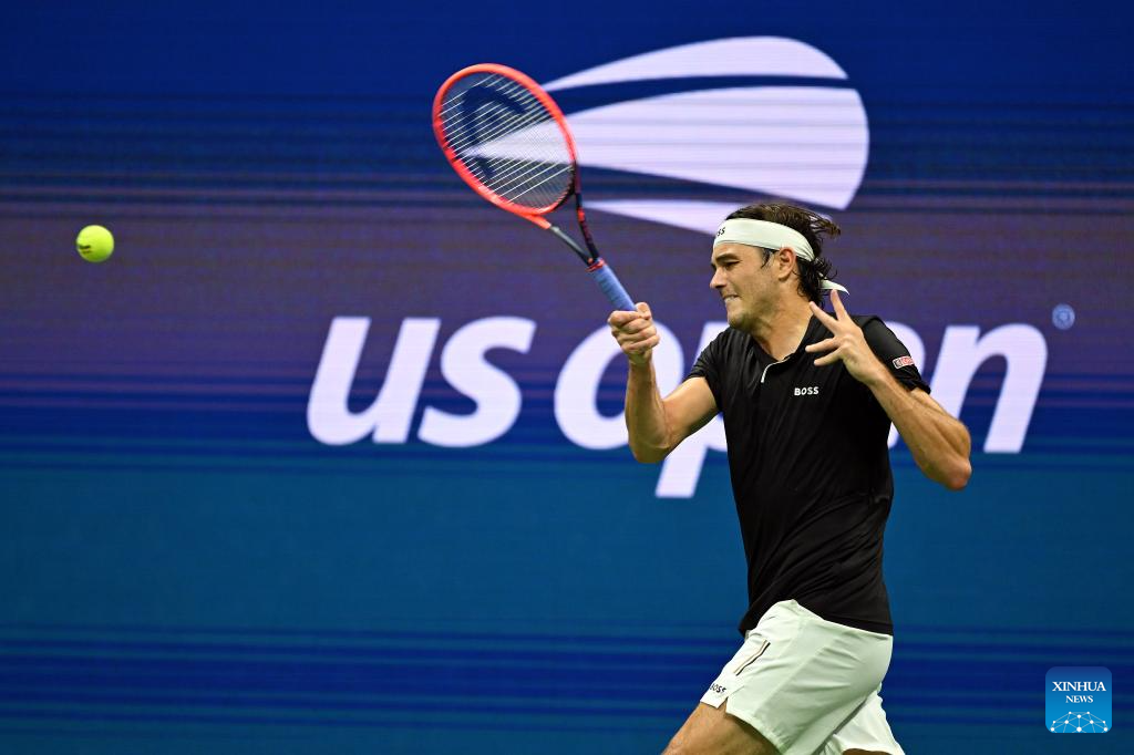 Taylor Fritz of the United States hits a return during the men's semifinal match against Frances Tiafoe of the United States at the 2024 US Open tennis championships in New York, the United States, Sept. 6, 2024. (Xinhua/Li Rui)