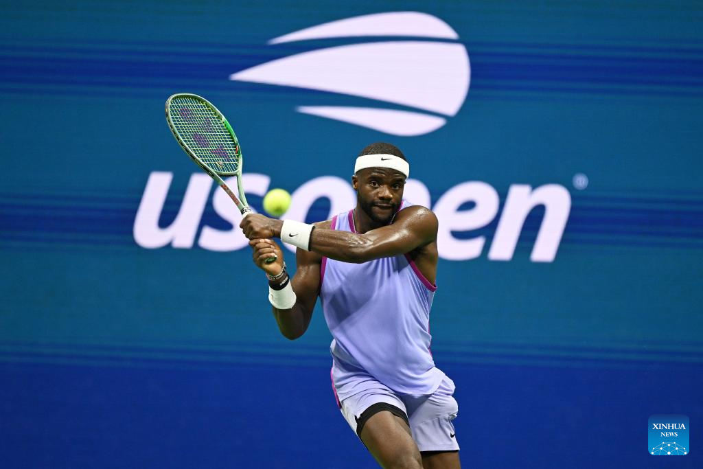 Frances Tiafoe of the United States hits a return during the men's semifinal match against Taylor Fritz of the United States at the 2024 US Open tennis championships in New York, the United States, Sept. 6, 2024. (Xinhua/Li Rui)