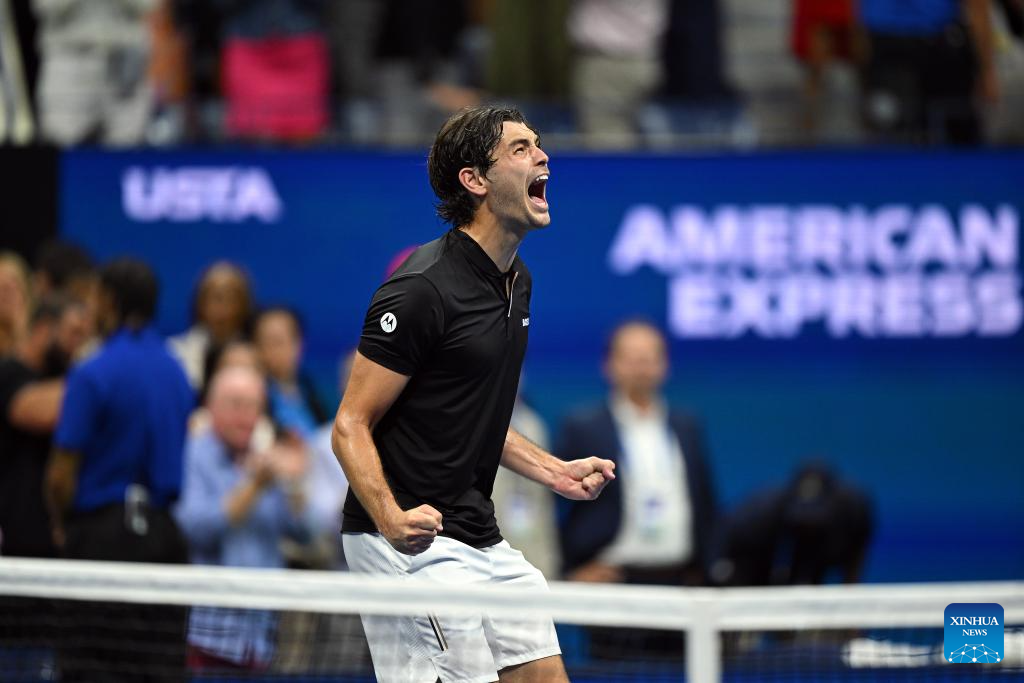 Taylor Fritz of the United States celebrates after winning the men's semifinal match against Frances Tiafoe of the United States at the 2024 US Open tennis championships in New York, the United States, Sept. 6, 2024. (Xinhua/Li Rui)