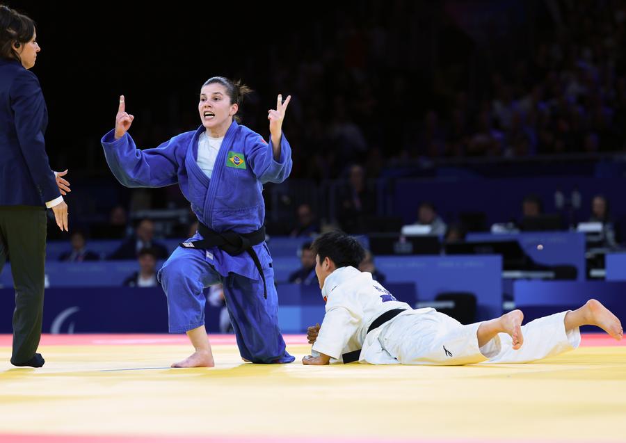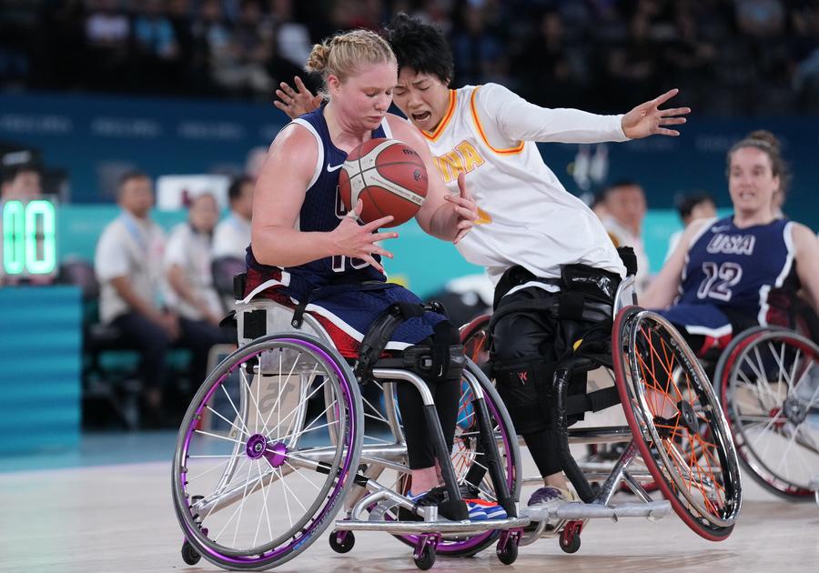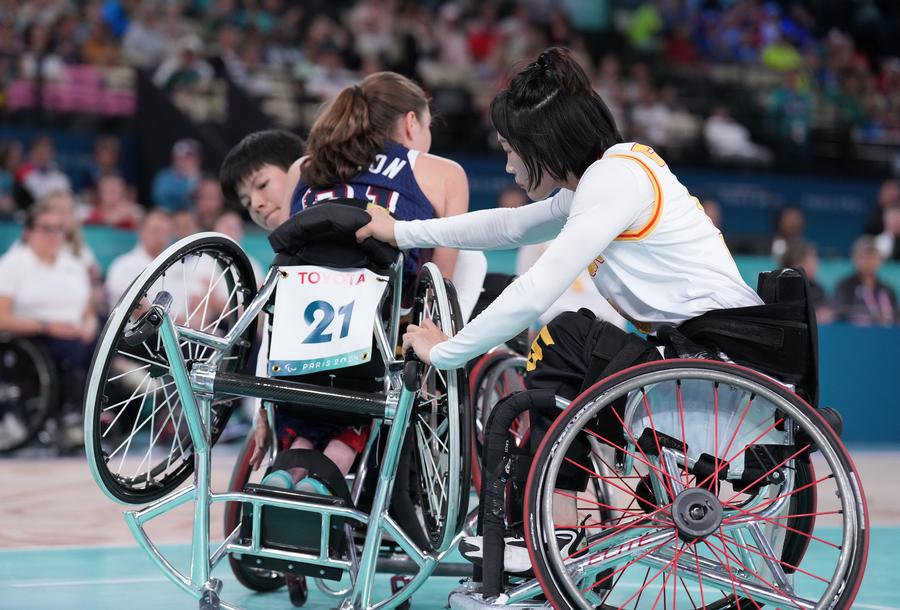 Alana Martins Maldonado (2nd R) of Brazil celebrates after the women's -70 kg J2 final of para judo at the Paris 2024 Paralympic Games in Paris, France, Sept. 6, 2024. (Xinhua/Hou Jun)Liu Li (C) of China hugs with Brenda Souza de Freitas (R) of Brazil after winning the women's -70 kg J1 final of para judo at the Paris 2024 Paralympic Games in Paris, France, Sept. 6, 2024. (Xinhua/Hou Jun)Bailey Moody (2nd L) and Ixhelt Gonzalez of the United States hug after winning the Women's Wheelchair Basketball Semifinal match between China and the United States at the Paris 2024 Paralympic Games in Paris, France, Sept. 6, 2024. (Xinhua/He Canling)Zhang Tonglei of China controls the ball during the Women's Wheelchair Basketball Semifinal match between China and the United States at the Paris 2024 Paralympic Games in Paris, France, Sept. 6, 2024. (Xinhua/He Canling)Zhang Xuemei (R) of China defends Rose Hollermann of the United States during the Women's Wheelchair Basketball Semifinal match between China and the United States at the Paris 2024 Paralympic Games in Paris, France, Sept. 6, 2024. (Xinhua/Gao Jing)Chen Xuejing (R) and Lyu Guidi of China help Kaitlyn Eaton of the United States to get up during the Women's Wheelchair Basketball Semifinal match between China and the United States at the Paris 2024 Paralympic Games in Paris, France, Sept. 6, 2024. (Xinhua/Gao Jing)