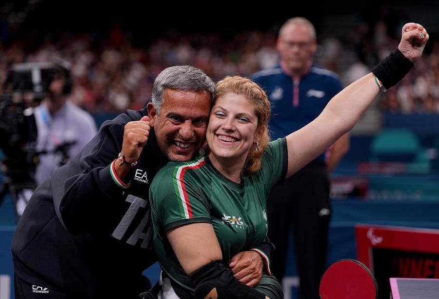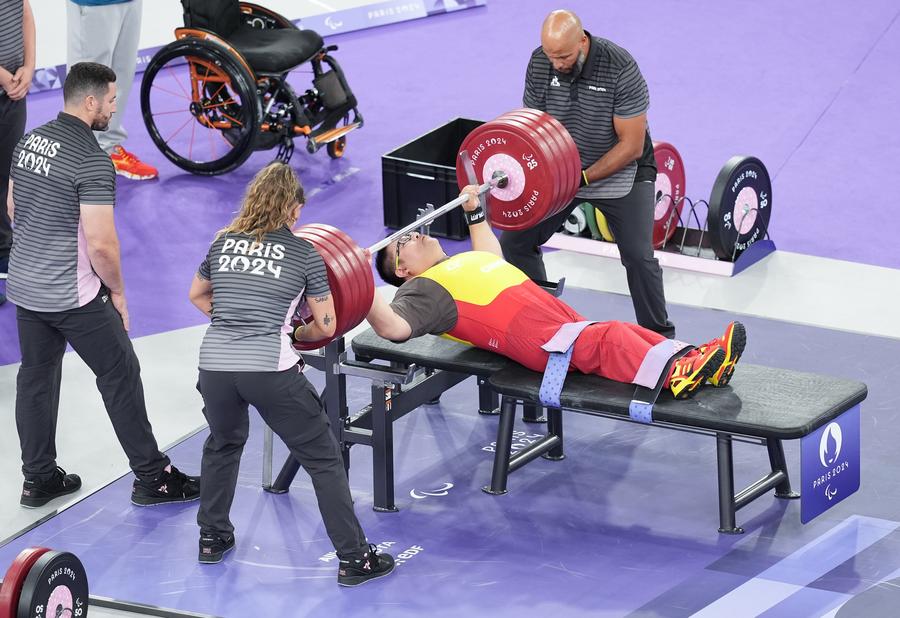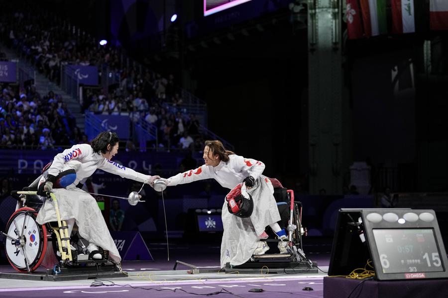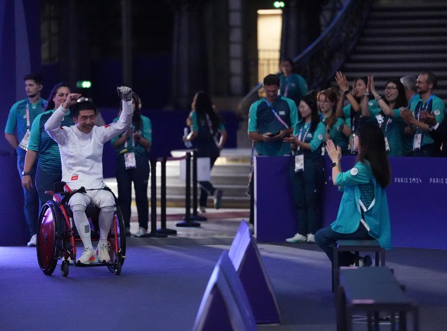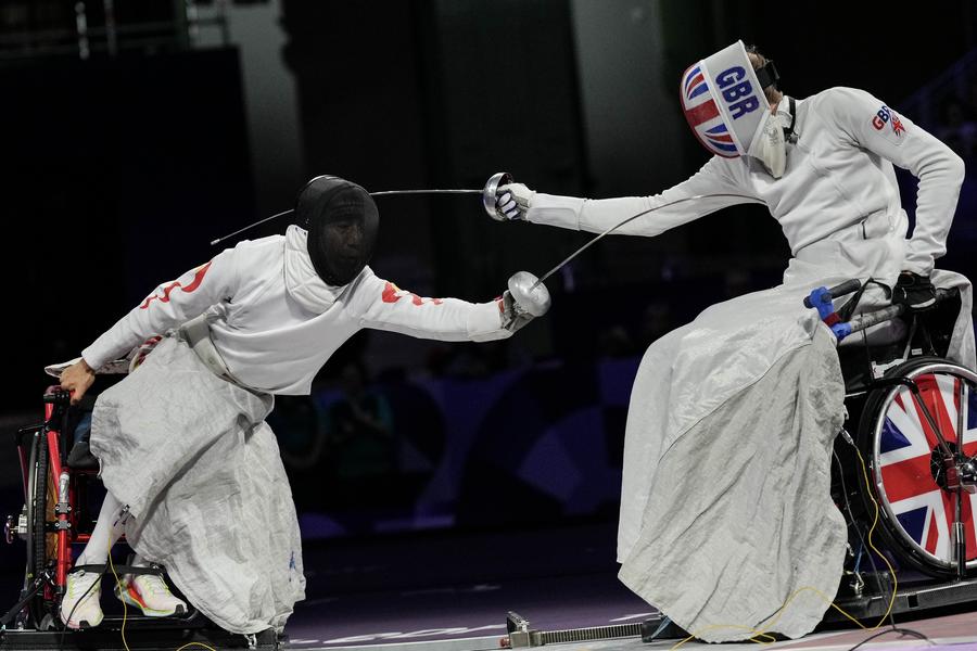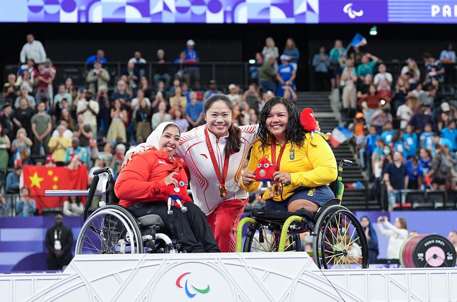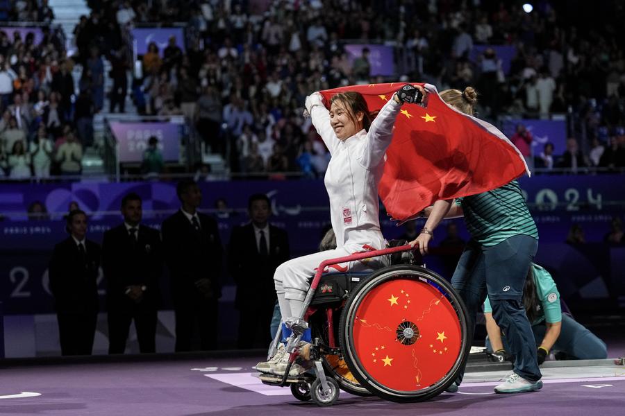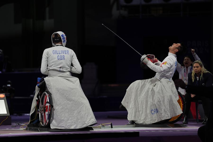 Gu Xiaofei of China competes during the men's up to 80kg final of the para powerlifting at the Paris 2024 Paralympic Games in Paris, France, Sept. 6, 2024. (Xinhua/Lian Yi)Roohallah Rostami of Iran celebrates after winning the men's up to 80kg final of the para powerlifting at the Paris 2024 Paralympic Games in Paris, France, Sept. 6, 2024. (Xinhua/Lian Yi)Giada Rossi (R) of Italy celebrates after winning the Para Table Tennis women's singles WS1-2 final match against Liu Jing of China at the Paris 2024 Paralympic Games in Paris, France, Sept. 6, 2024. (Xinhua/Hou Zhaokang)Gold medalist Tan Yujiao (C) of China, silver medalist Fatma Elyan (L) of Egypt and bronze medalist Maria de Fatima Costa De Castro of Brazil pose during the awarding ceremony for the para powerlifting women's up to 67kg event at the Paris 2024 Paralympic Games in Paris, France, Sept. 6, 2024. (Xinhua/Lian Yi)Tan Yujiao of China celebrates during the para powerlifting women's up to 67kg final at the Paris 2024 Paralympic Games in Paris, France, Sept. 6, 2024. (Xinhua/Lian Yi)Sun Gang (L) of China reacts after winning the Wheelchair Fencing men's epee category A final against Piers Gilliver of Britain at the Paris 2024 Paralympic Games in Paris, France, Sept. 6, 2024. (Xinhua/Xing Guangli)Photo taken on Sept. 6, 2024 shows the awarding ceremony for the Wheelchair Fencing women's epee category A event at the Paris 2024 Paralympic Games in Paris, France. (Xinhua/Xing Guangli)Chen Yuandong (R) of China shakes hands with Kwon Hyo Kyeong of South Korea after their Wheelchair Fencing women's epee category A final at the Paris 2024 Paralympic Games in Paris, France, Sept. 6, 2024. (Xinhua/Zhang Haofu)Sun Gang (R) of China reacts during the Wheelchair Fencing men's epee category A final against Piers Gilliver of Britain at the Paris 2024 Paralympic Games in Paris, France, Sept. 6, 2024. (Xinhua/Xing Guangli)Sun Gang (L) of China competes against Piers Gilliver of Britain during their Wheelchair Fencing men's epee category A final at the Paris 2024 Paralympic Games in Paris, France, Sept. 6, 2024. (Xinhua/Zhang Haofu)Photo taken on Sept. 6, 2024 shows the awarding ceremony for the Wheelchair Fencing women's epee category A event at the Paris 2024 Paralympic Games in Paris, France. (Xinhua/Zhang Haofu)Chen Yuandong of China celebrates after winning the Wheelchair Fencing women's epee category A final against Kwon Hyo Kyeong of South Korea at the Paris 2024 Paralympic Games in Paris, France, Sept. 6, 2024. (Xinhua/Zhang Haofu)■