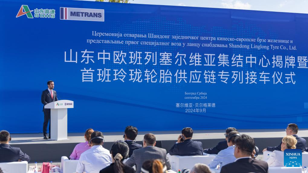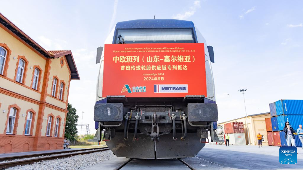 The first specialized supply chain train for China's Shandong Linglong Tyre Co., Ltd., of China-Europe Express Railway arrives in Indjija, Belgrade, Sept, 7, 2024. (Photo by Wang Wei/Xinhua)