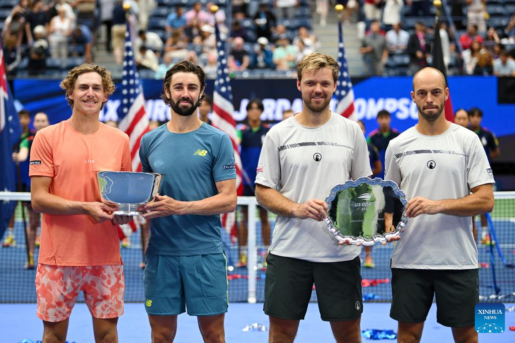 Max Purcell (1st L), Jordan Thompson (2nd L) , Kevin Krawietz (2nd R) and Tim Puetz celebrate during the awarding ceremony for the men's final match between Max Purcell/Jordan Thompson of Australia and Kevin Krawietz/Tim Puetz of Germany at the 2024 US Open tennis championships in New York, the United States, Sept. 7, 2024. (Xinhua/Li Rui)