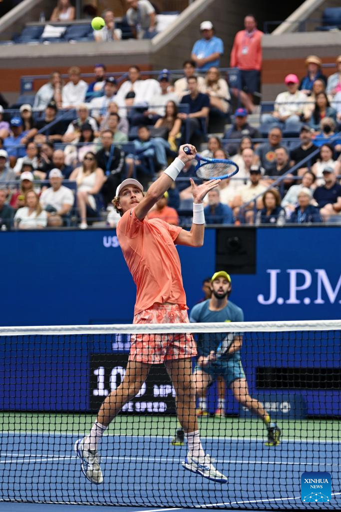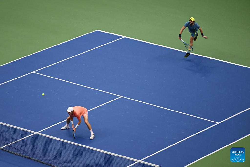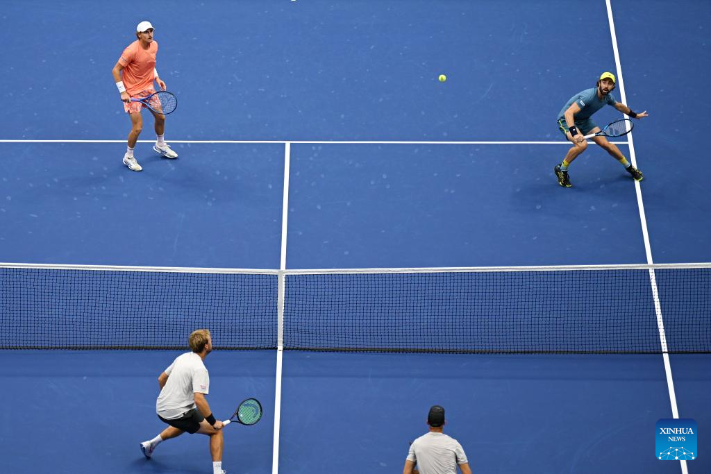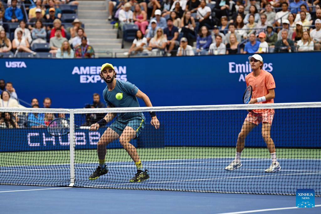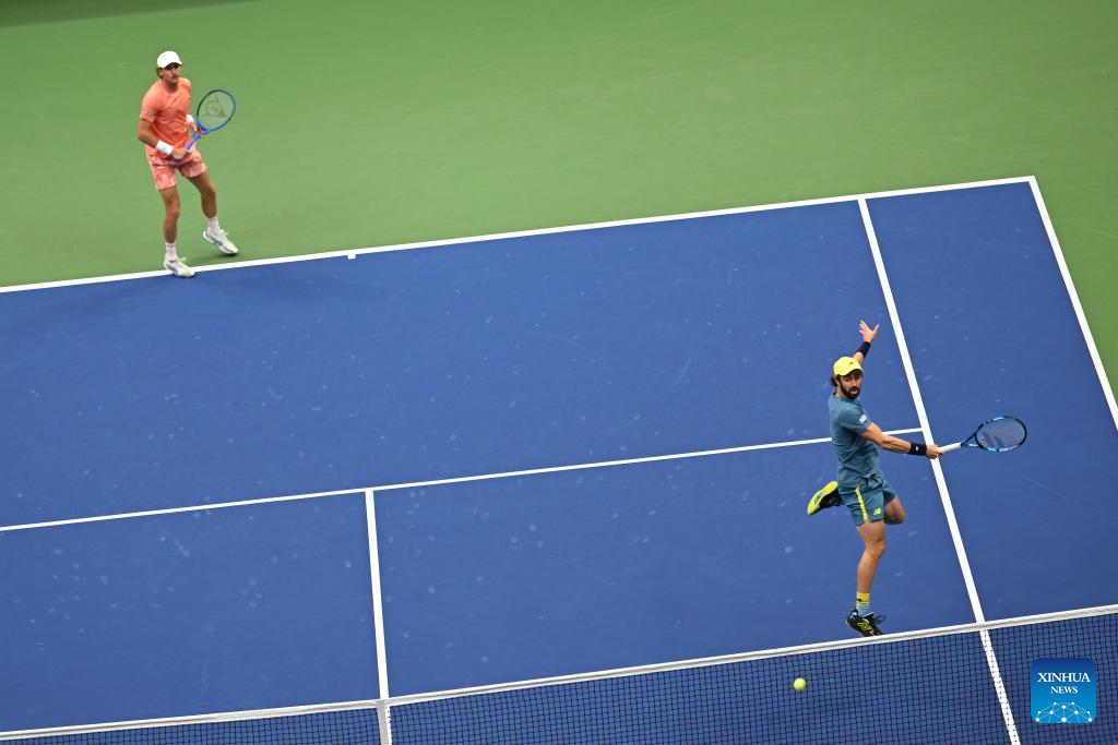 Max Purcell (R) and Jordan Thompson compete during the men's final match between Max Purcell/Jordan Thompson of Australia and Kevin Krawietz/Tim Puetz of Germany at the 2024 US Open tennis championships in New York, the United States, Sept. 7, 2024. (Xinhua/Li Rui)