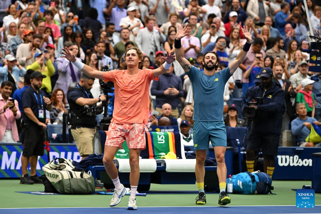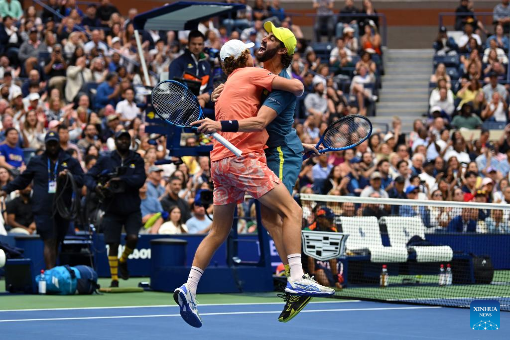 Max Purcell (L) and Jordan Thompson celebrate after the men's final match between Max Purcell/Jordan Thompson of Australia and Kevin Krawietz/Tim Puetz of Germany at the 2024 US Open tennis championships in New York, the United States, Sept. 7, 2024. (Xinhua/Li Rui)