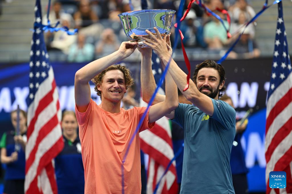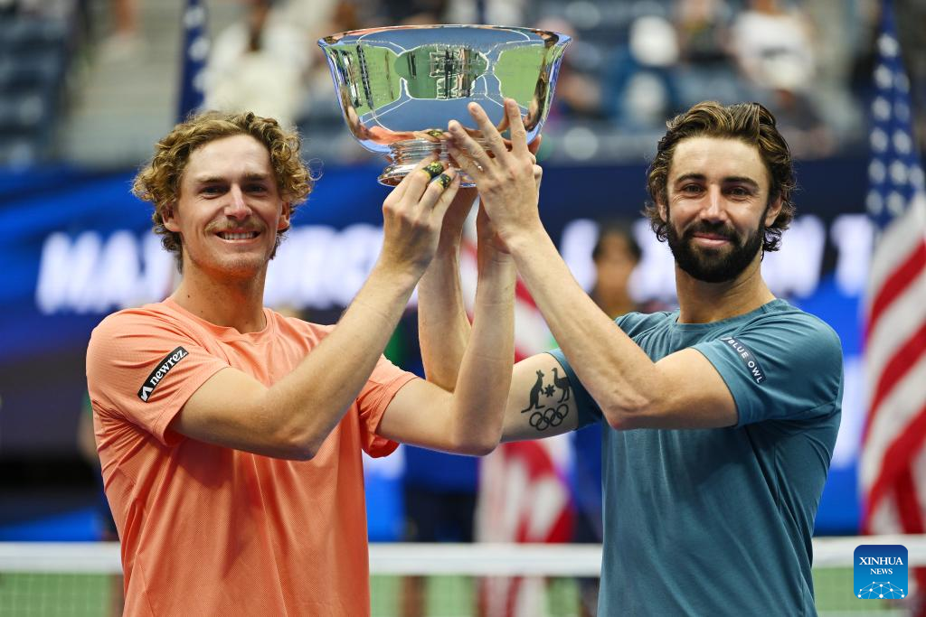 Max Purcell (L) and Jordan Thompson celebrate during the awarding ceremony for the men's final match between Max Purcell/Jordan Thompson of Australia and Kevin Krawietz/Tim Puetz of Germany at the 2024 US Open tennis championships in New York, the United States, Sept. 7, 2024. (Xinhua/Li Rui)