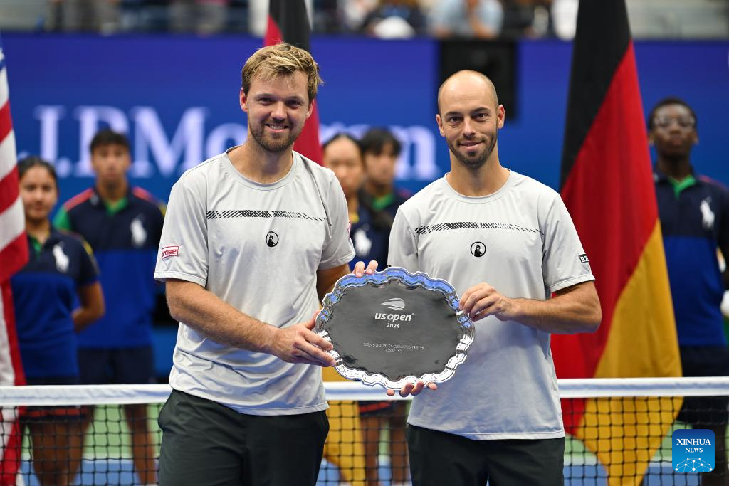 Kevin Krawietz (L) and Tim Puetz celebrate during the awarding ceremony for the men's final match between Max Purcell/Jordan Thompson of Australia and Kevin Krawietz/Tim Puetz of Germany at the 2024 US Open tennis championships in New York, the United States, Sept. 7, 2024. (Xinhua/Li Rui)