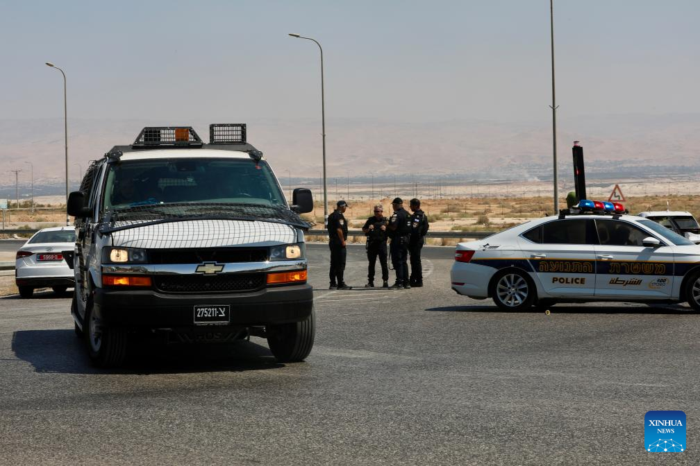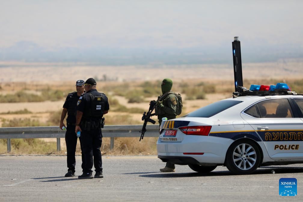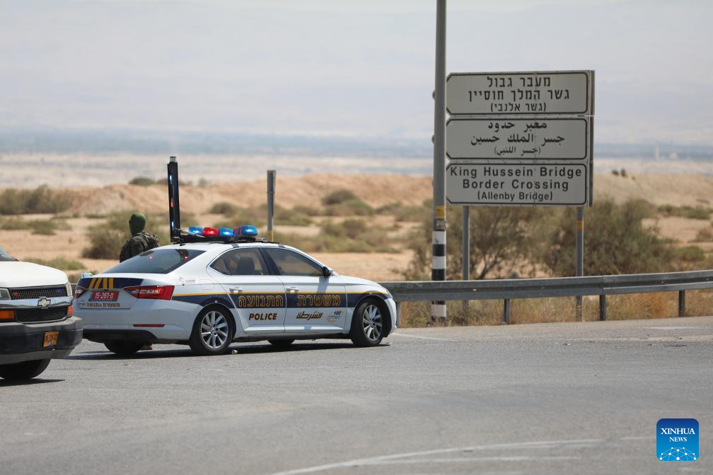 Israeli police patrol near the Allenby Bridge, a key crossing point between the Israeli-occupied West Bank and Jordan, after a shooting attack on Sept. 8, 2024. A gunman opened fire on Sunday at the Allenby Bridge, killing three people before being shot dead by Israeli forces, Israeli officials said. (Photo by Jamal Awad/Xinhua)