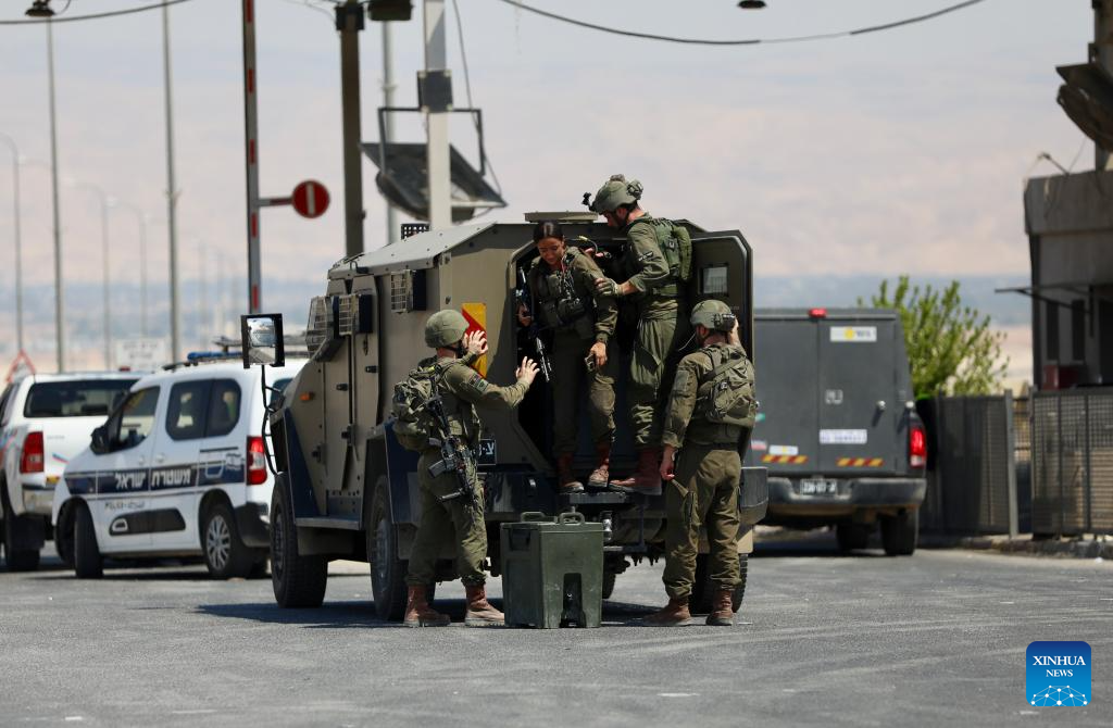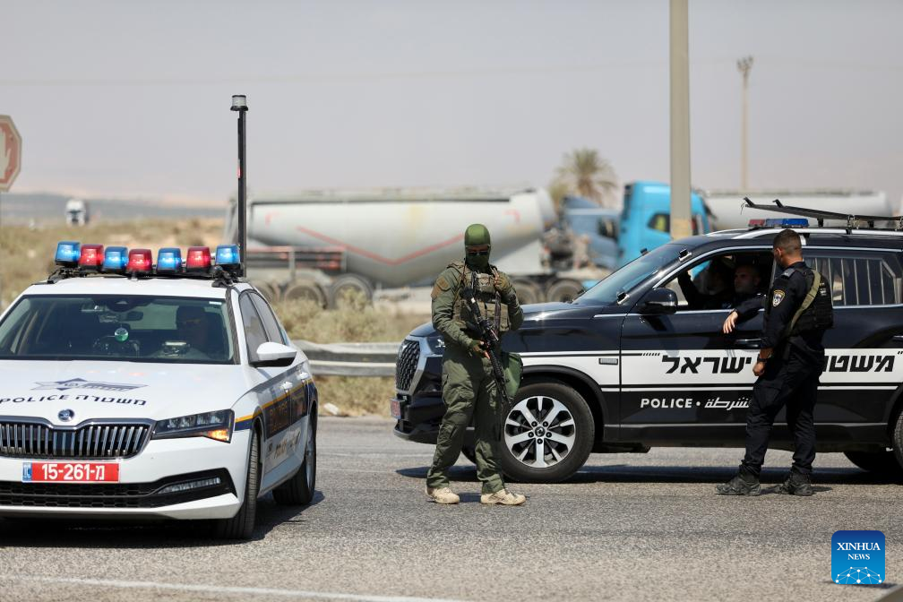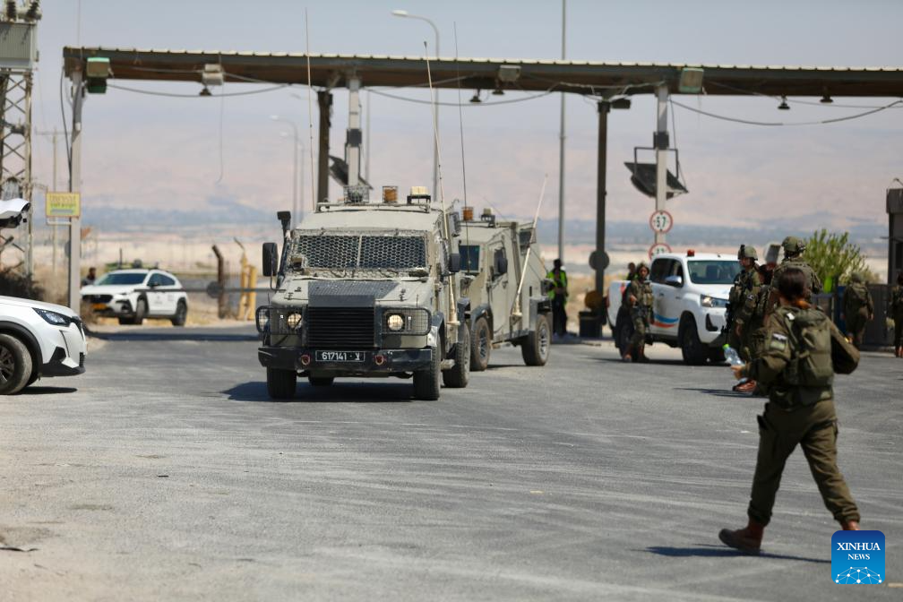 Israeli security forces stand guard near the Allenby Bridge, a key crossing point between the Israeli-occupied West Bank and Jordan, after a shooting attack on Sept. 8, 2024. A gunman opened fire on Sunday at the Allenby Bridge, killing three people before being shot dead by Israeli forces, Israeli officials said. (Photo by Jamal Awad/Xinhua)