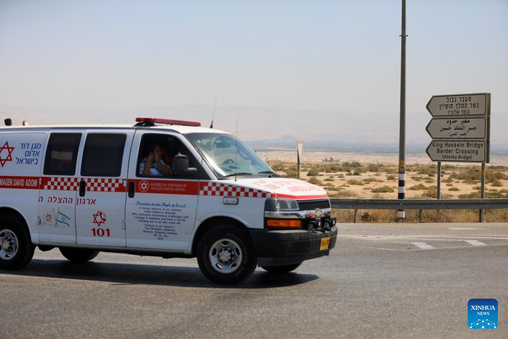 An ambulance is seen near the Allenby Bridge, a key crossing point between the Israeli-occupied West Bank and Jordan, after a shooting attack on Sept. 8, 2024. A gunman opened fire on Sunday at the Allenby Bridge, killing three people before being shot dead by Israeli forces, Israeli officials said. (Photo by Jamal Awad/Xinhua)