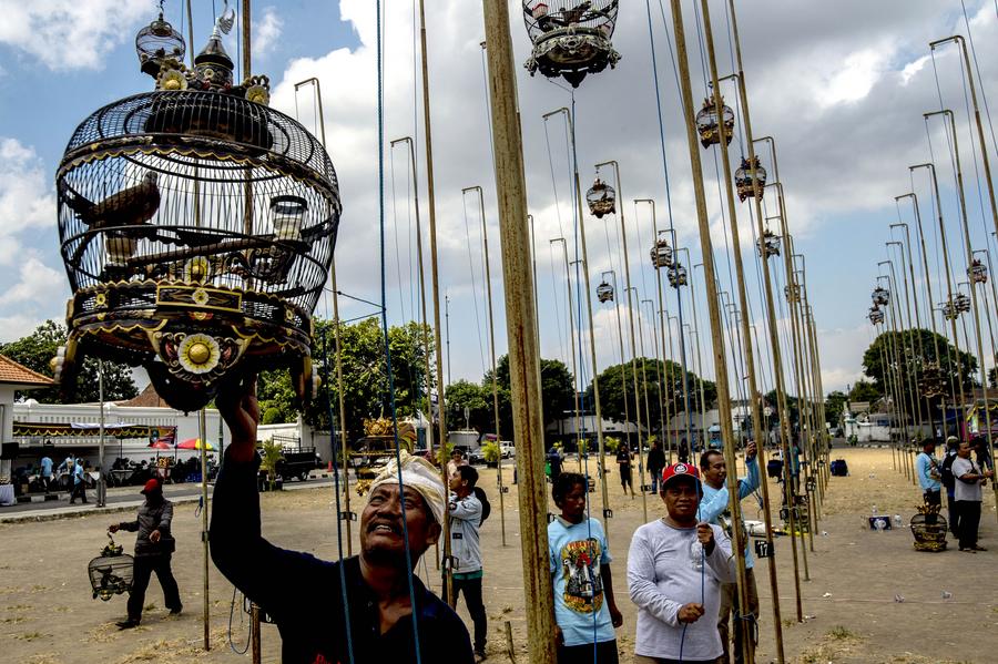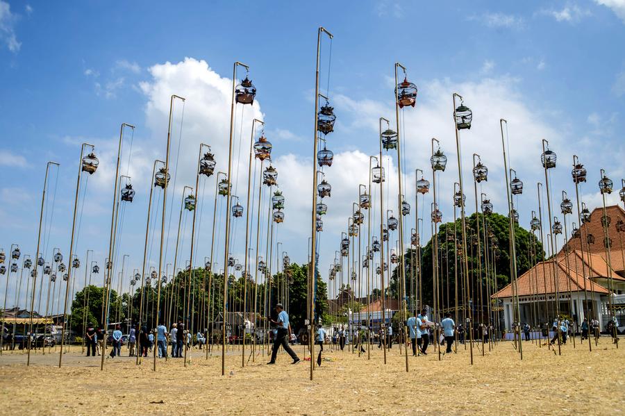 YOGYAKARTA, Indonesia, Sept. 9 (Xinhua) -- A turtledove chirping contest took place on Sunday in Yogyakarta, Indonesia, attracting many tourists and locals. Hundreds of bird cages were hung highly in the air, and judges stood below to score.