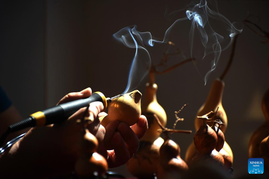 Gourd pyrography is an art of decorating the gourd by burning a graphic design on the surface with heated tools. The class of gourd pyrography given by Zhu since 2020 has gained popularity among students. (Photo by Zhao Dongshan/Xinhua)