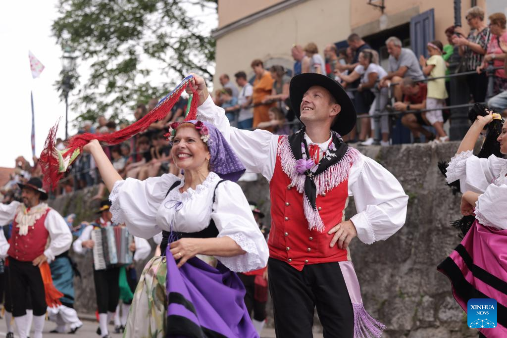 The 51st National Costumes and Clothing Heritage Day ended Sunday in Kamnik with a traditional parade, during which about 2,000 participants dressed in national costumes walking through the center of Kamnik. (Photo by Zeljko Stevanic/Xinhua)