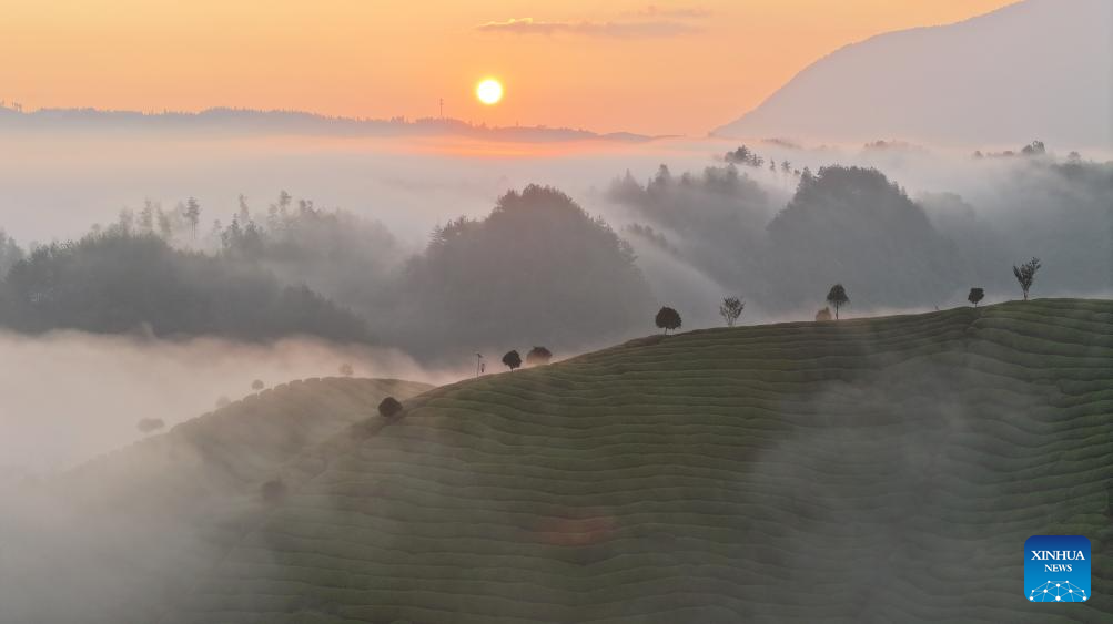 An aerial drone photo shows a tea garden in Mu'er Mountain in Zouma Town of Hefeng County, central China's Hubei Province, Sept. 9, 2024. (Photo by Yang Shunpi/Xinhua)