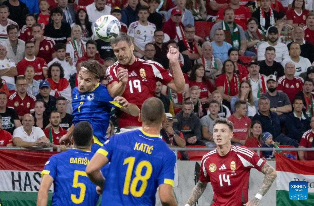 Amar Dedic (top L) of Bosnia and Herzegovina vies with Barnabas Varga (top R) of Hungary during the UEFA Nations League Group A3 match between Hungary and Bosnia and Herzegovina in Budapest, Hungary, Sept. 10, 2024. (Photo by Attila Volgyi/Xinhua)