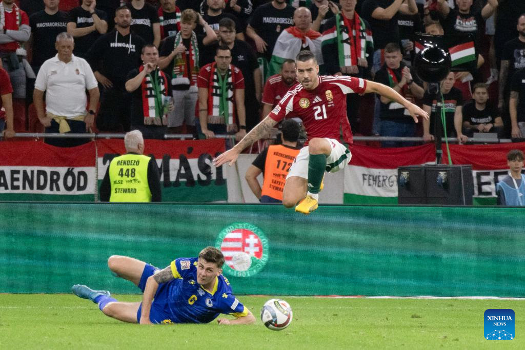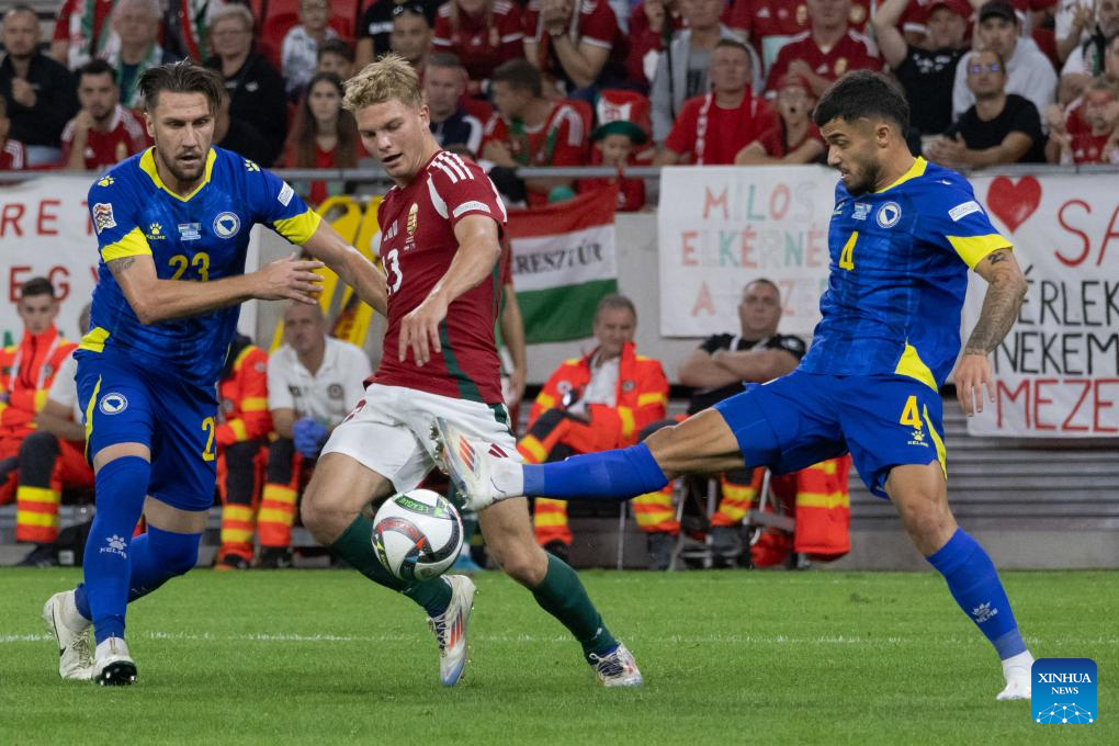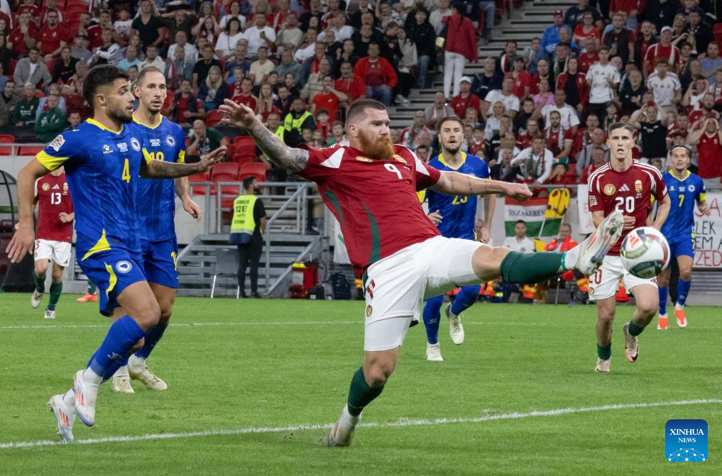 Martin Adam (front R) of Hungary shoots during the UEFA Nations League Group A3 match between Hungary and Bosnia and Herzegovina in Budapest, Hungary, Sept. 10, 2024. (Photo by Attila Volgyi/Xinhua)