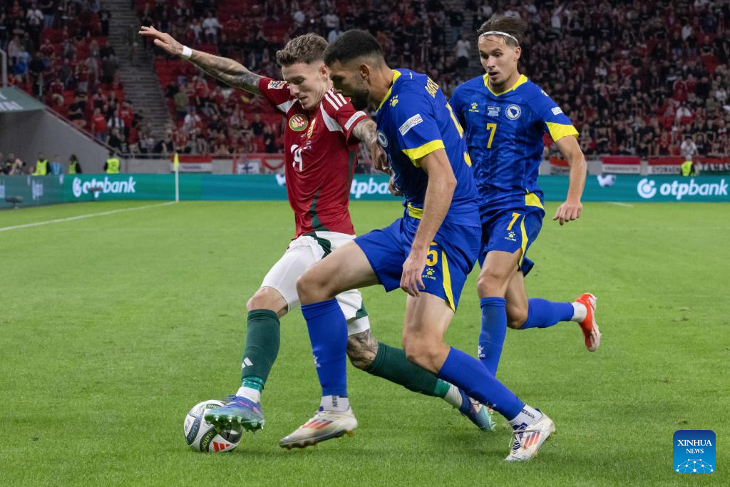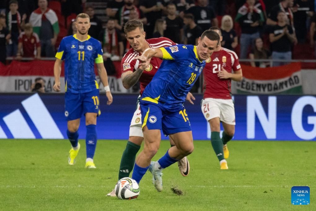 Tamas Nikitscher (front L) of Hungary vies with Dario Saric (front R) of Bosnia and Herzegovina during the UEFA Nations League Group A3 match between Hungary and Bosnia and Herzegovina in Budapest, Hungary, Sept. 10, 2024. (Photo by Attila Volgyi/Xinhua)