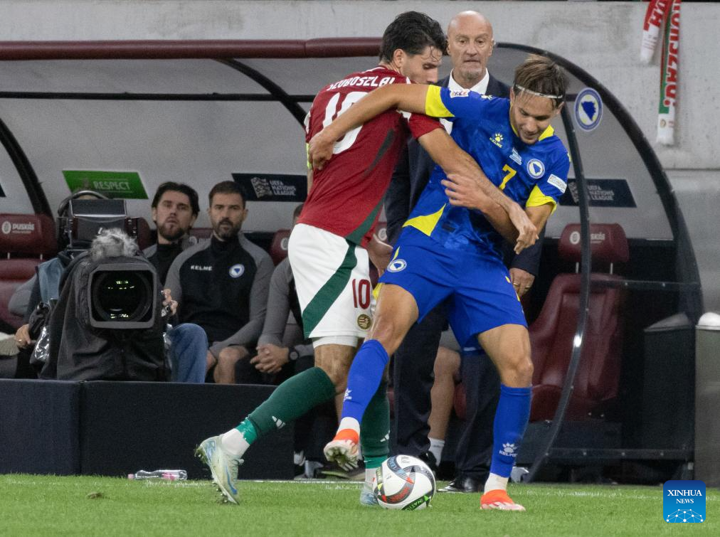 Jusuf Gazibegovic (R) of Bosnia and Herzegovina competes during the UEFA Nations League Group A3 match between Hungary and Bosnia and Herzegovina in Budapest, Hungary, Sept. 10, 2024. (Photo by Attila Volgyi/Xinhua)
