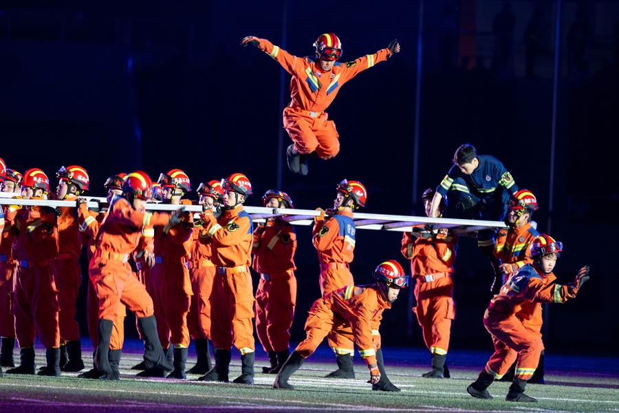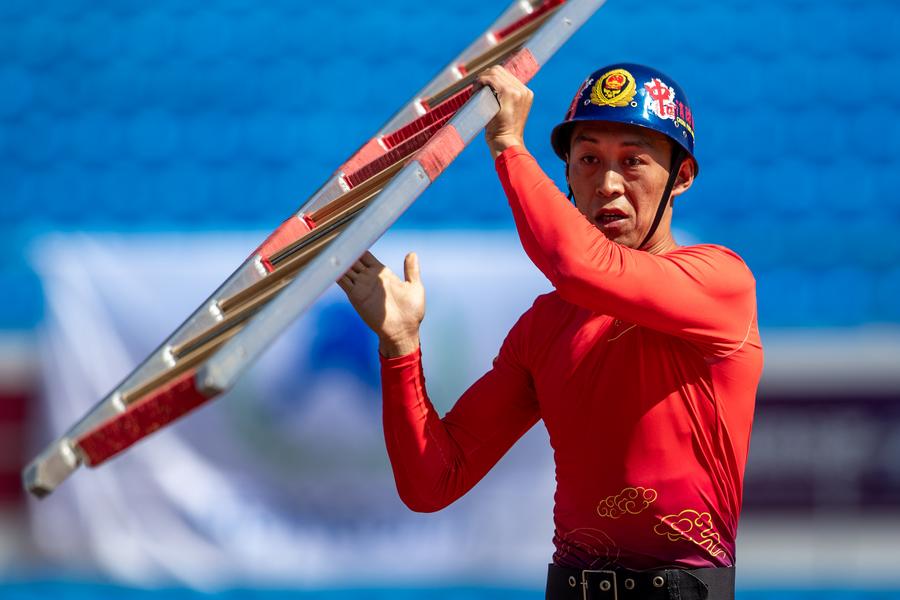 HARBIN, Sept. 11 (Xinhua) -- Signaled by a whistle, helmeted contestants rushed forward with ladders, crossing obstacle boards and single-log bridges to spray water at simulated fire sites in under a minute.