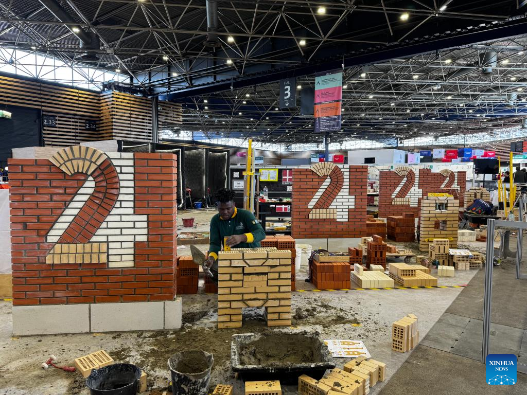 A contestant competes in a bricklaying contest during the 47th WorldSkills Competition in Lyon, France, Sept. 12, 2024. The 47th WorldSkills Competition (WSC) officially commenced on Tuesday evening with an opening ceremony at the LDLC Arena located near the city of Lyon in France.