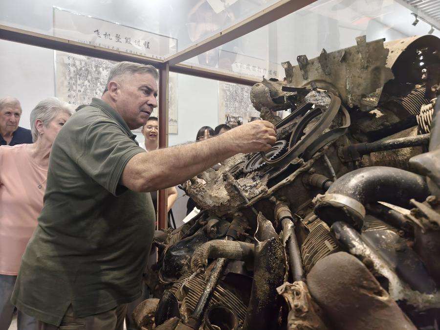 HEFEI, Sept. 11 (Xinhua) -- Jeffrey Greene, 70, was deeply moved by the sight of wreckage from Flying Tigers bombers displayed at an exhibition in Huimin Village in Anqing City, east China's Anhui Province.